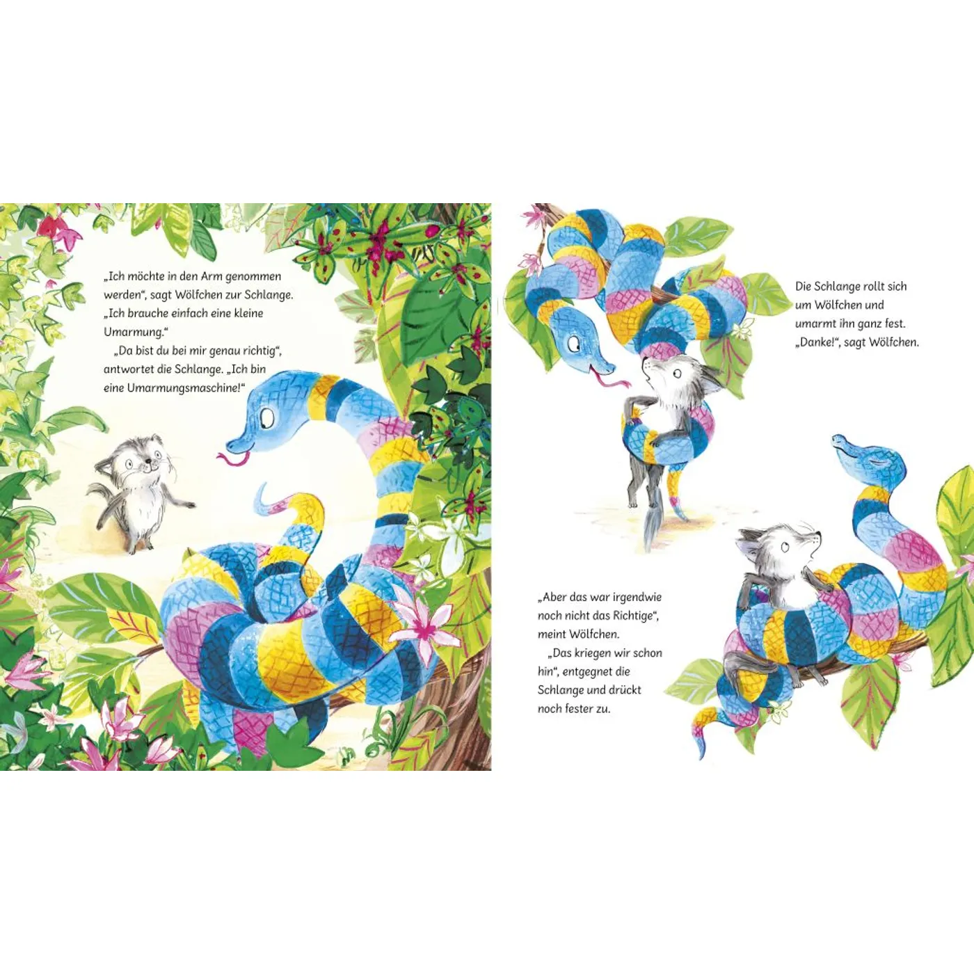Das kleine Wölfchen wünscht sich nichts sehnlicher, als von seinen Freunden in den Arm genommen zu werden. Doch nicht jede Umarmung fühlt sich gut an, denn seine Dschungelfreunde drücken manchmal zu fest oder zu grob.