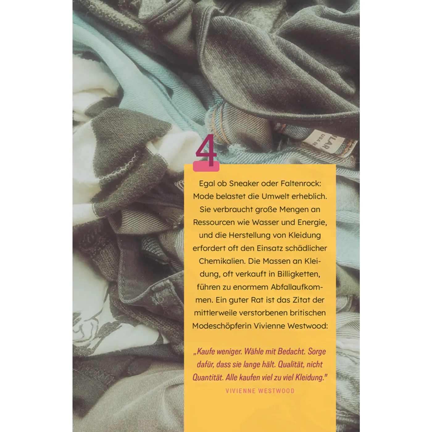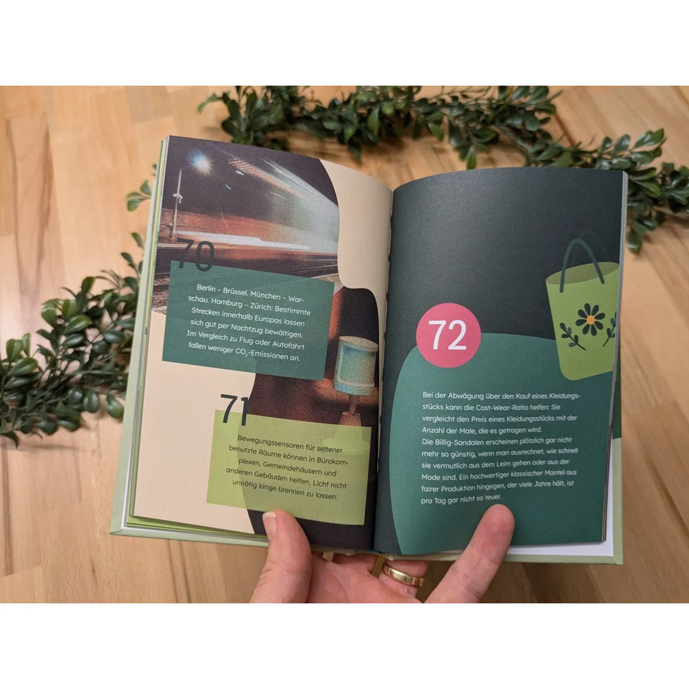 Sodann folgt auf jeder Seite eine oder zwei dieser Tipps oder Ideen. Zugegebenermaßen sind einige bereits sehr bekannt (bspw. Kleidertauschpartys oder dass Lebensmittel auch oft nach Überschreiten des Mindesthaltbarkeitsdatum noch essbar sind). Wer also auf wirklich neue bahnbrechende Erkenntnisse hofft, wird hier nicht fündig. Vielmehr habe ich persönlich das Buch als kleinere Zusammenstellung von Nachhaltigkeitsideen gesehen, welche sowohl für Familien mit Kindern als auch für Paare oder Singles alltagstauglich umsetzbar sind. Die Aufmachung der einzelnen Seiten ist dabei sehr abwechslungsreich. Teilweise sind die Seiten mit Fotografien hinterlegt und manchmal ist der Hintergrund mit geometrischen Formen gestaltet. Insgesamt ist die gestalterische Aufmachung des Buchs stimmig.