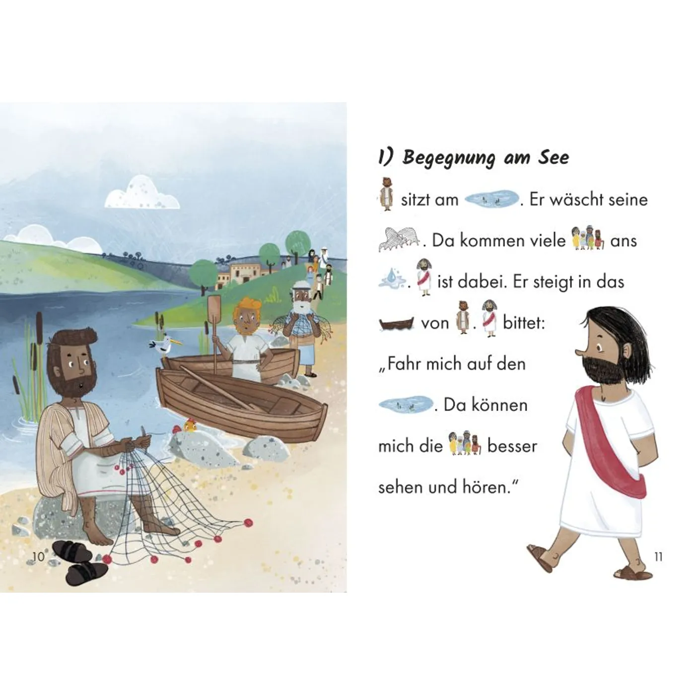 Die Brillen-Bär Reihe im Brunnen Verlag enthält entzückende Bücher über Gottes Liebe in kindgerechter Sprache. Katrin Grieco schreibt kindgerecht und liebevoll. Die Sätze sind kurz und flüssig. Die Hauptwörter werden von Bildern ersetzt. Das ist ein idealer Einstieg für Kindergarten Kinder in die wunderbare Welt des Lesens. Und auch praktisch und motivierend für Erstleser in der Volksschule. Tolle Bilder und bunte Farben runden das Buch ab. Die Bilder sind kreativ und verständlich, so dass die Kinder Petrus, Jesus und die Jünger schnell wiedererkennen.