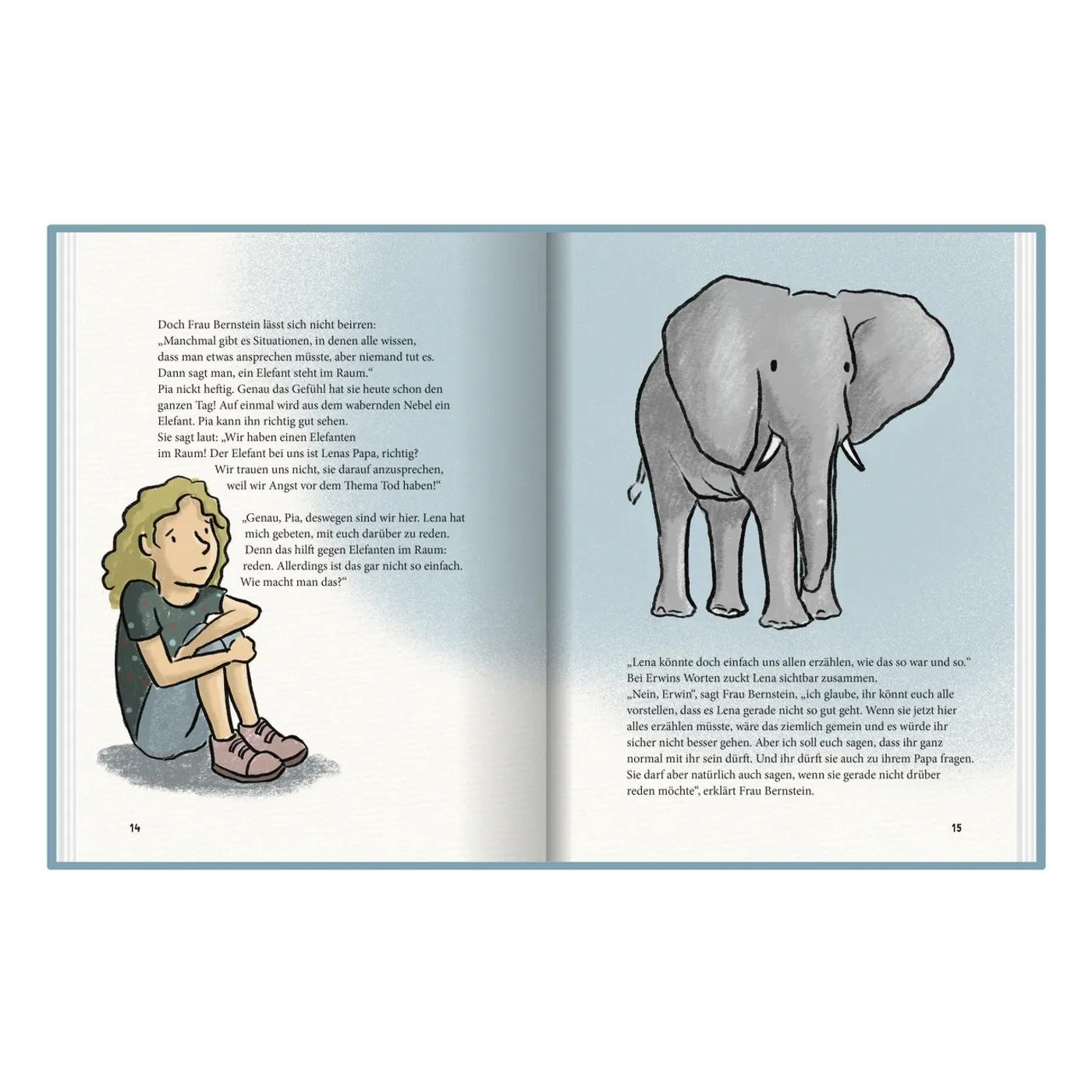 Lenas Papa ist in den Sommerferien gestorben. Pia weiß gar nicht, wie sie nun mit ihrer Freundin umgehen soll. Der erste Schultag nach den Ferien verläuft ungeschickt. Das Thema steht unausgesprochen zwischen ihnen wie ein dicker Elefant. Auch die Lehrerinnen und Lehrer sind zunächst überfordert. Doch am Ende finden alle einen Weg, das Thema anzusprechen und behutsam miteinander Lenas Erlebnisse anzugehen. Denn Elefanten im Raum sollten angesprochen werden!