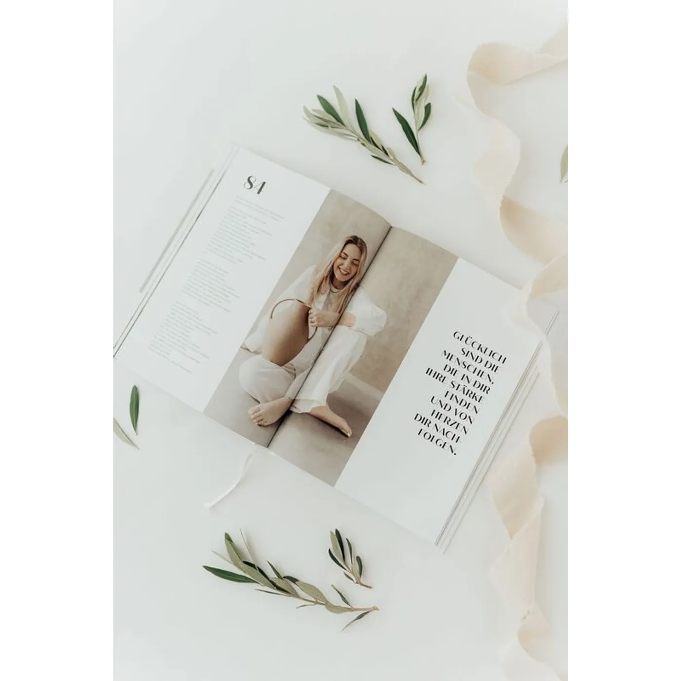 Das A4 große wertige Hardcoverbuch ist wunderschön. Der Einband ist fest und schwer, das Papier ist ebenfalls etwas fester. Die zurückhaltende Gestaltung, die sich auf dem Cover zeigt, setzt sich im Inneren fort. Weiß ist sehr dominant, den Versen wird viel Raum zugestanden. Auf jeder Doppelseite gibt es mindestens ein schönes passendes Foto, das aber farblich auch eher zurückhaltend ist. Das Blättern im Buch macht Spaß und man findet immer mal wieder einen Vers, an dem man hängen bleibt und liest. Ein weißes Lesebändchen komplettiert das Buch gelungen.