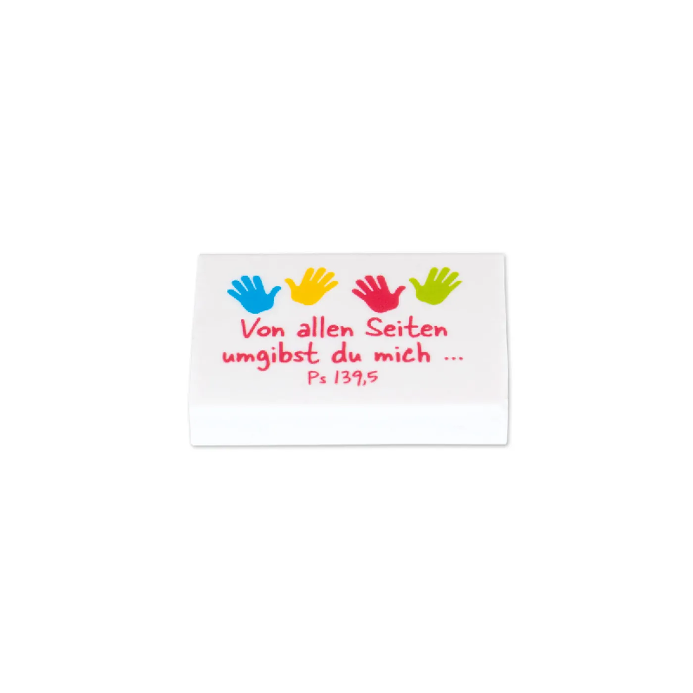 Unsere Radiergummi Hände sind schön bunt gestaltet und mit Text: Von allen Seiten umgibst du mich...Ps. 139. 5.