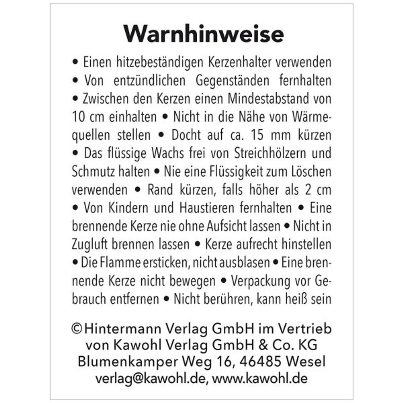 Einen hitzebeständigen Kerzenhalter verwenden, Von entzündlichen Gegenständen fern halten, Zwischen den Kerzen einen Mindestabstand von 10 cm einhalten, Nicht in die Nähe von Wärmequellen stellen, Docht auf ca. 15 mm kürzen, Das flüssige Wachs frei von Streichhölzern und Schmutz halten, Nie eine Flüssigkeit zum Löschen verwenden, Rand kürzen falls höher als 2 cm, Von Kindern und Haustieren fern halten, Eine brennende Kerze nie ohne Aufsicht lassen, Nicht in Zugluft brennen lassen, Kerze aufrecht hinstellen, Die Flamme ersticken nicht ausblasen, Eine brennende Kerze nicht bewegen, Verpackung vor Gebrauch entfernen, Nicht berühren kann heiß sein