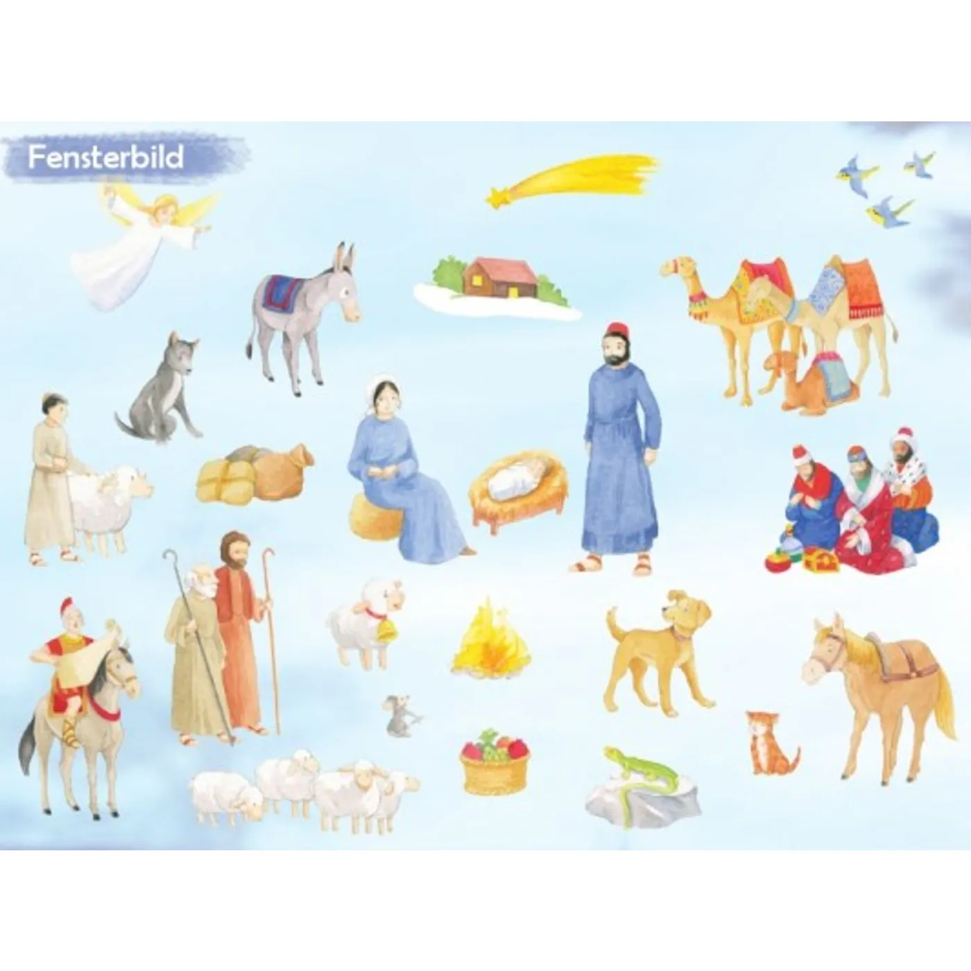 Zu jedem Kapitel der Adventskalendergeschichte gibt es ein Folienbild, das ans Fenster geklebt werden kann. Am 24. Dezember ist dann ein schönes weihnachtliches Fensterbild, das die Krippenszene inklusive der tierischen Erzähler zeigt, entstanden.