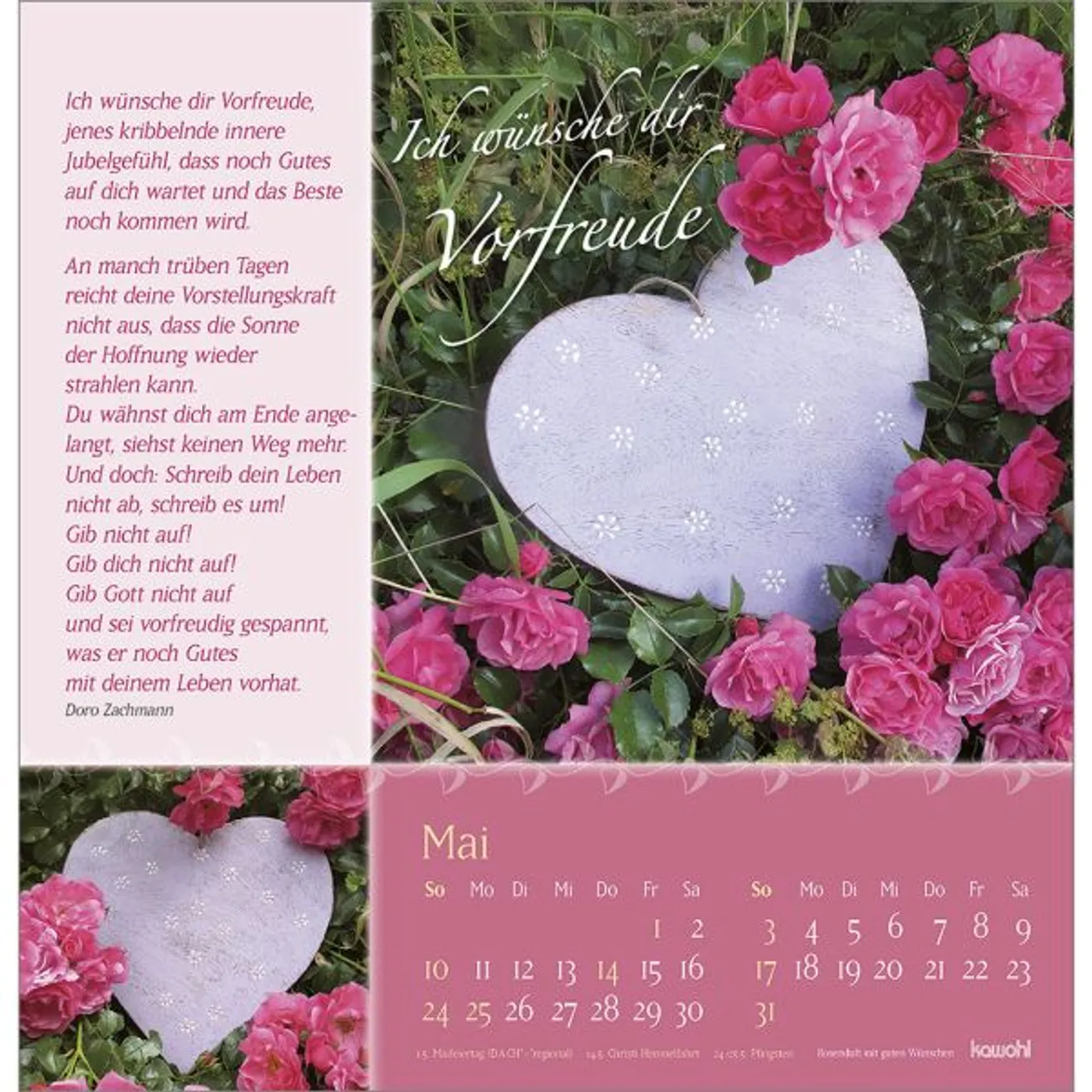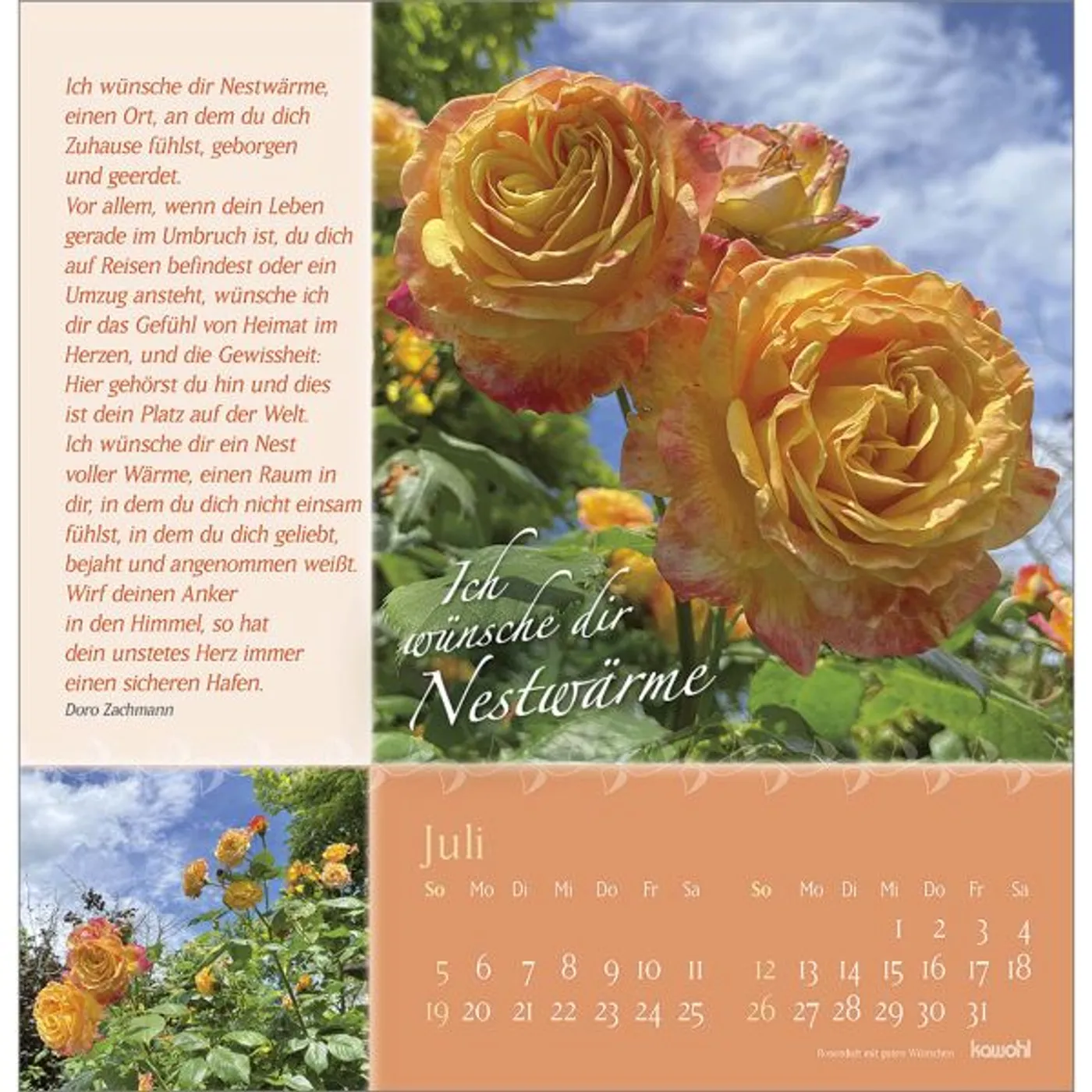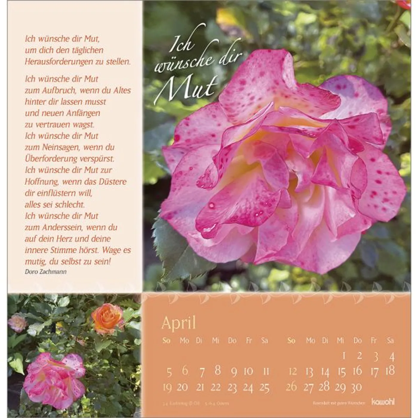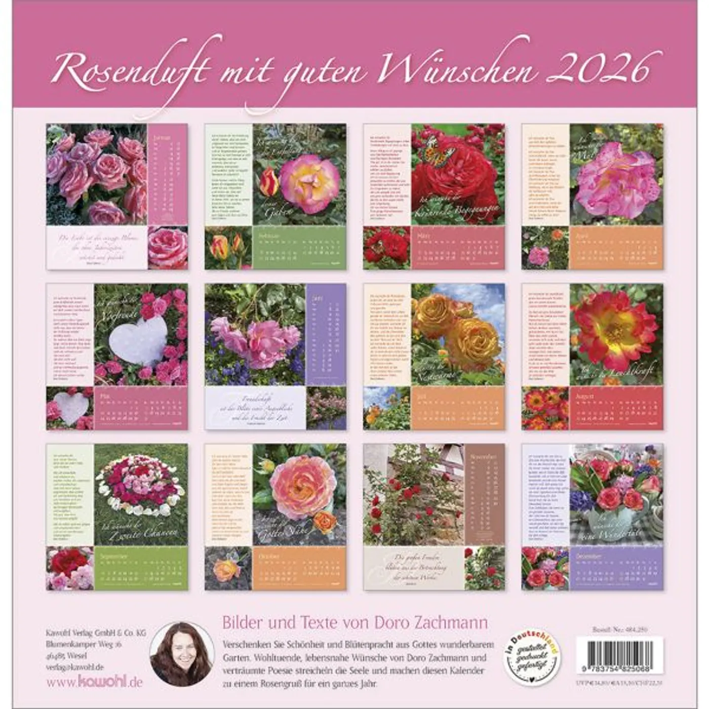 Verschenken Sie Schönheit und Blütenpracht aus Gottes wunderbarem Garten. Wohltuende, lebensnahe Wünsche von Doro Zachmann und verträumte Poesie streicheln die Seele und machen diesen Kalender zu einem Rosengruß für ein ganzes Jahr.