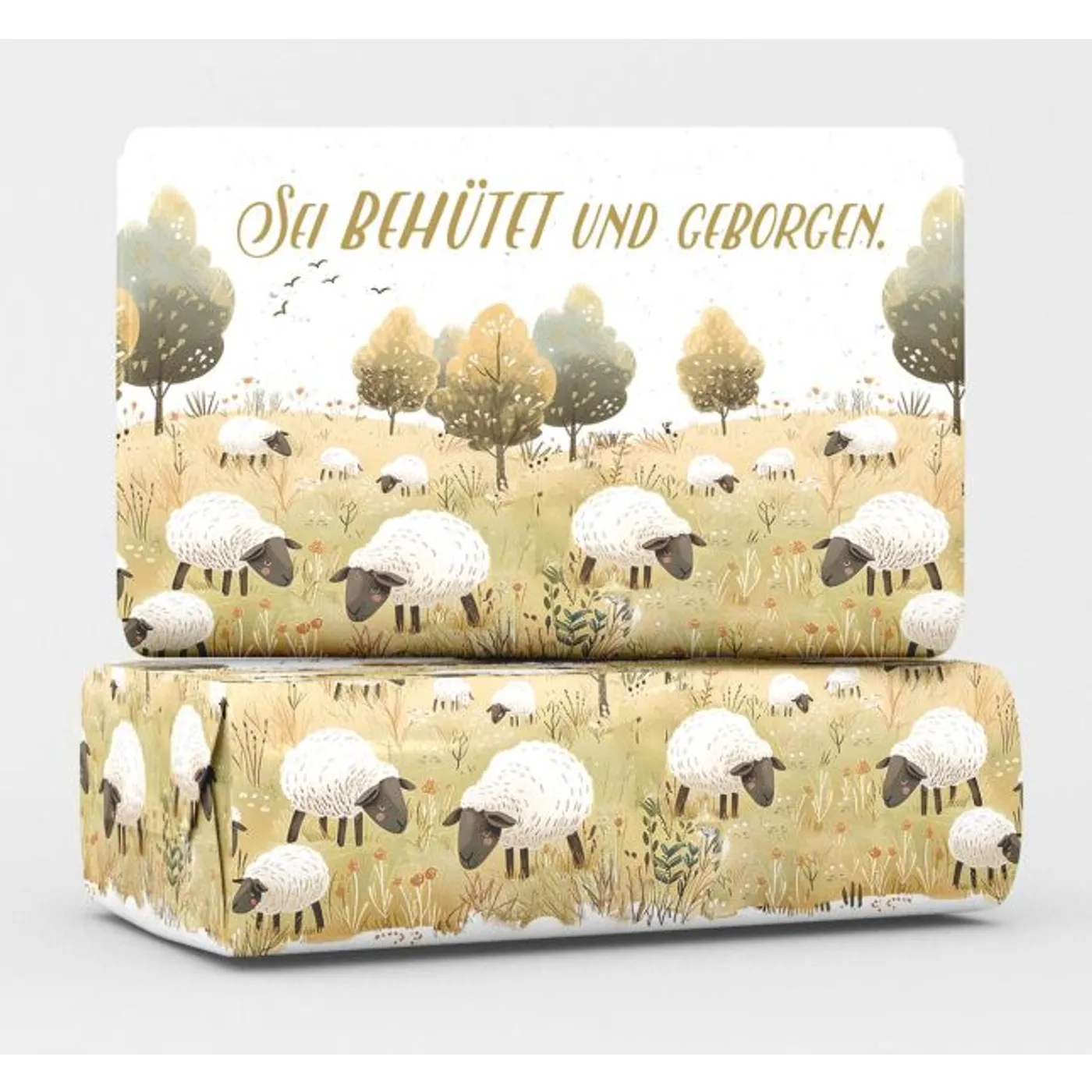 Erlebe die sanfte Pflege unserer hochwertigen Schafmilchseife mit einer liebevollen Illustration von Schafen auf einer grünen Weide, inspiriert von der Kollektion Herzensfreude. Der ermutigende Spruch „Sei behütet und geborgen.“ macht sie zu einem besonderen Highlight, ideal für dich selbst oder als liebevolles Geschenk. Diese handgefertigte Seife aus Österreich vereint 100 % biologische Schafmilch, pflanzliche Öle und Lanolin für eine schonende Reinigung und intensive Pflege empfindlicher Haut.