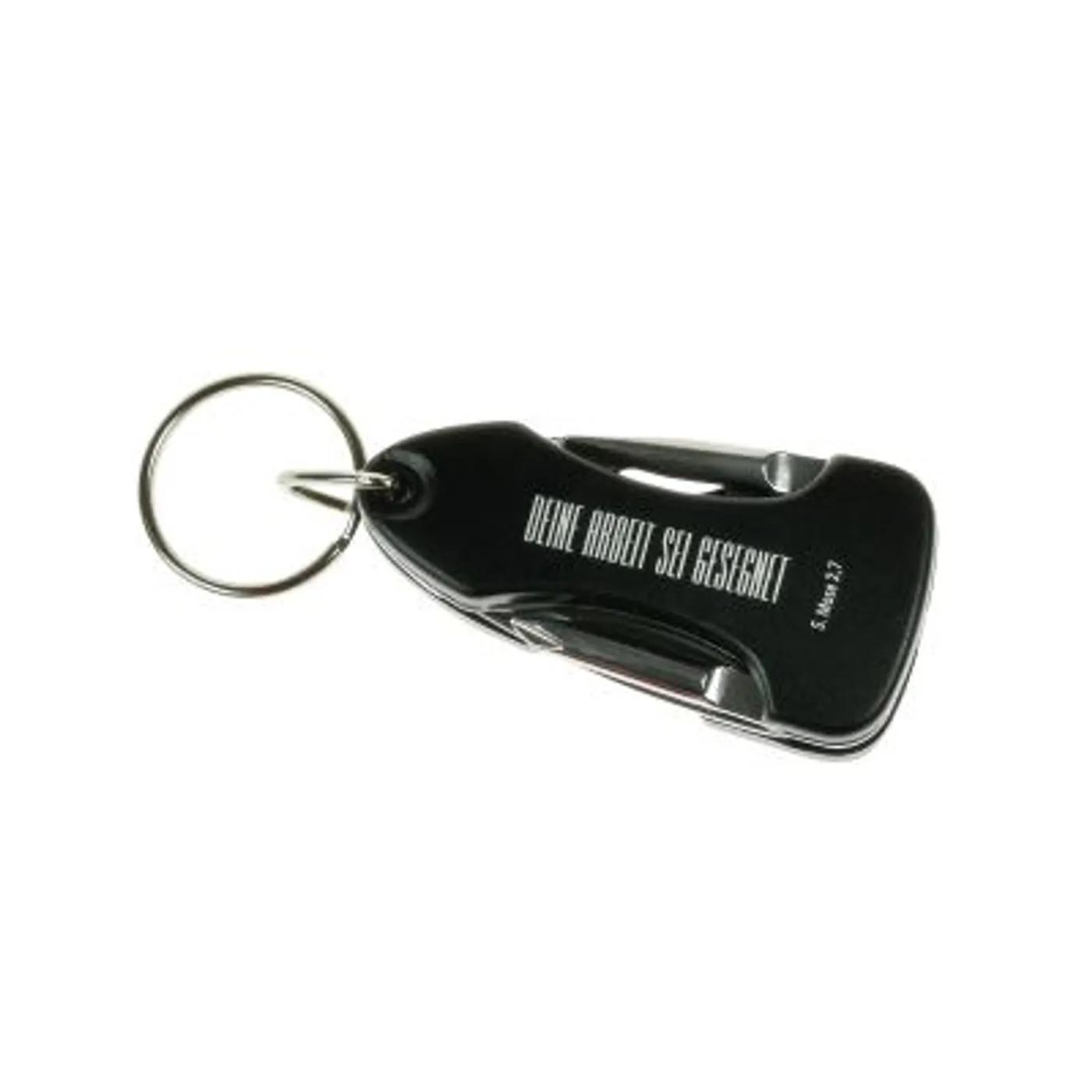 Vielseitig verwendbares Multitool aus Metall als Schlüsselanhänger. Mit 5 Funktionen: LED-Licht, Flach- und Kreuzschraubendreher, Flaschenöffner und Messer. Veredelt mit der Lasergravur „Deine Arbeit sei gesegnet 5. Mose 2,7“. Tool geschlossen ca. 6x3x1,5, Größe inkl. Ring ca. 9x3x1,5 cm. Mit Batterien, einzeln verpackt in Karton.