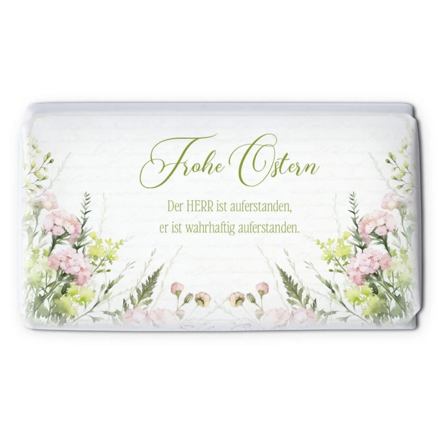 Erlebe den feinen Geschmack dieser Edelvollmilchschokolade, die nicht nur durch ihre Qualität, sondern auch durch ihre Botschaft überzeugt. Mit einem kunstvoll gestalteten Blumenfeld auf der Verpackung und dem Text „Frohe Ostern. Der HERR ist auferstanden, er ist wahrhaftig auferstanden.“ erinnert sie an die Hoffnung und Freude der Osterzeit. Der Bibeltext aus Lukas 24:34 unterstreicht die tiefere Bedeutung und macht diese Schokolade zu einem besonderen Geschenk für Ostern.