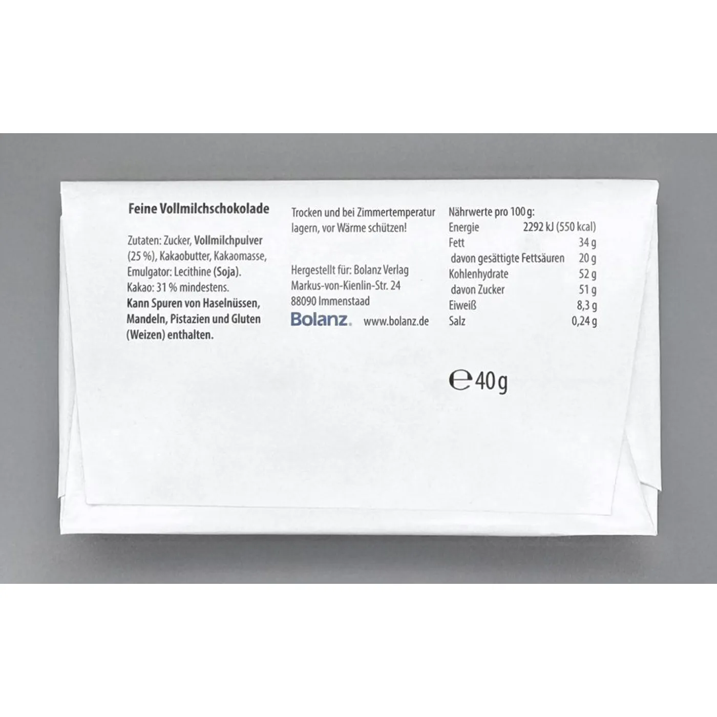 Zutaten: Zucker, Vollmilchpulver (25%), Kakaobutter, Kakaomasse, Emulgator: Lecithine (Soja). Kakao: 31% mindestens.