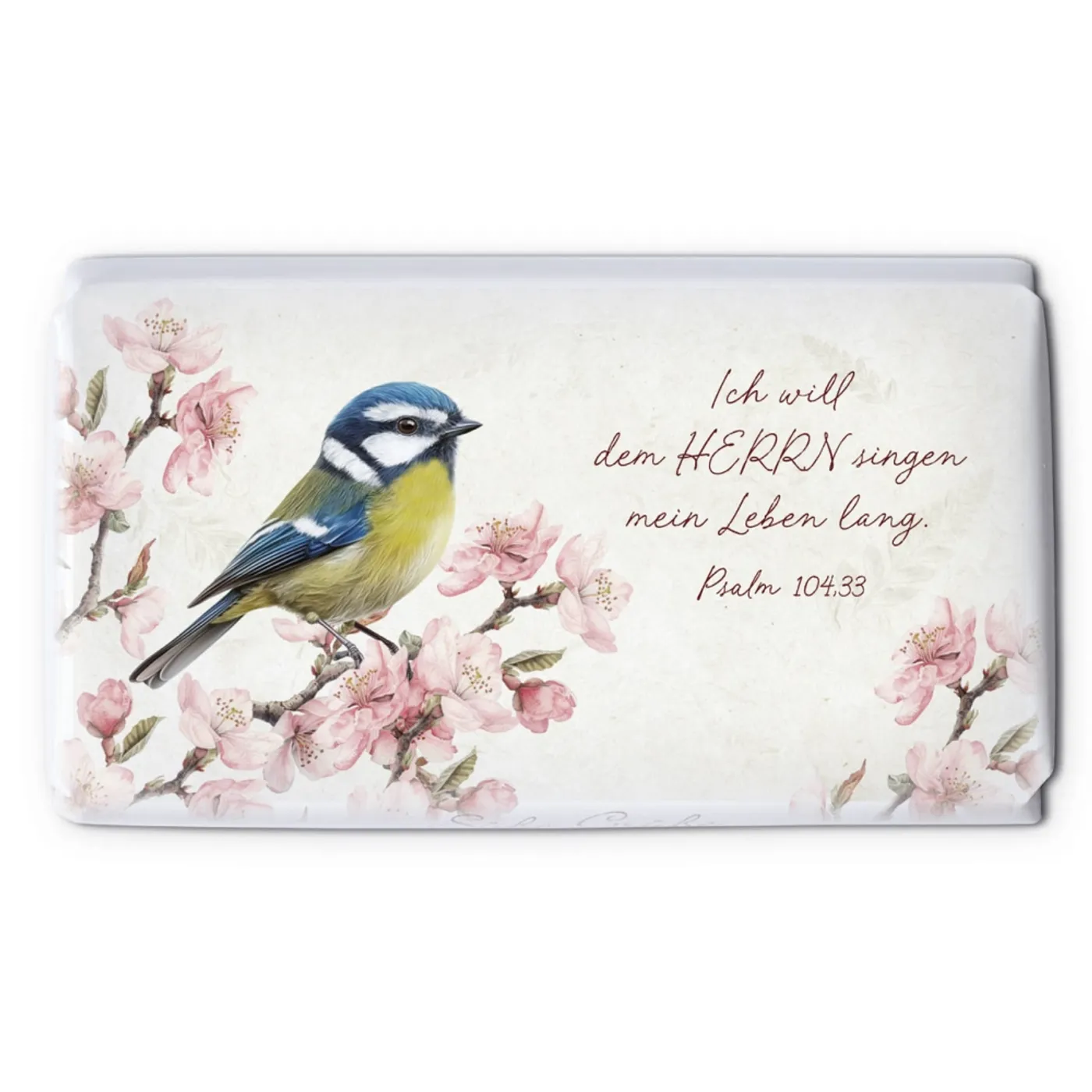 Erlebe mit unserer hochwertigen Schokolade eine köstliche Kombination aus Genuss und inspirierender Botschaft. Die Verpackung trägt die ermutigenden Worte aus Psalm 104,33: „Ich will dem Herrn singen mein Leben lang.“ Diese Botschaft lädt dazu ein, Freude und Lob in dein Leben zu bringen und Gottes Gegenwart bewusst zu feiern.