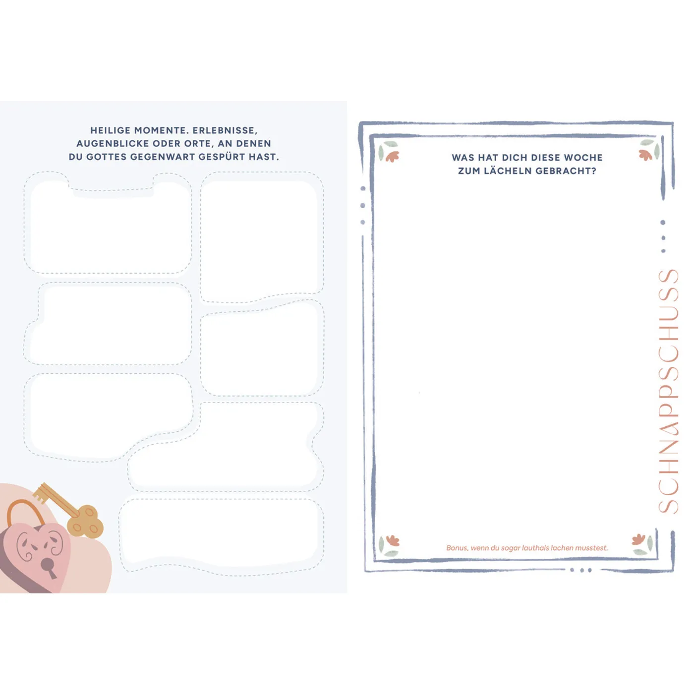 Dazu möchte dieses Tagebuch eine Hilfe sein. Auf jeder Seite befinden sich sieben Möglichkeiten, etwas aufzuschreiben, wofür man dankbar ist. Dafür gibt es jeweils tolle Ideen, zum Beispiel Gebetserhörungen, die schönsten Komplimente, für welche Menschen man dankbar ist, die schönsten Geschenke und vieles, vieles mehr. Die Ideen sind sehr vielfältig, sodass man beim Durchblättern immer etwas findet, was man Aufschreiben kann. Zusätzlich gibt es noch Seiten mit einem Wochenrückblick. Hier soll man konkret nennen, wofür man in der letzten Woche dankbar war.
