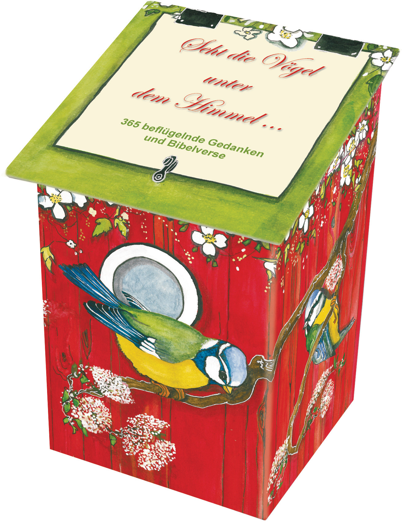 Diese Pappbox in fröhlich-bunter Vogelhäuschen-Optik enthält 365 Spruchkarten: Durch den aufklappbaren Deckel kann man jeden Tag ein "Vogel-Kärtchen" entnehmen!