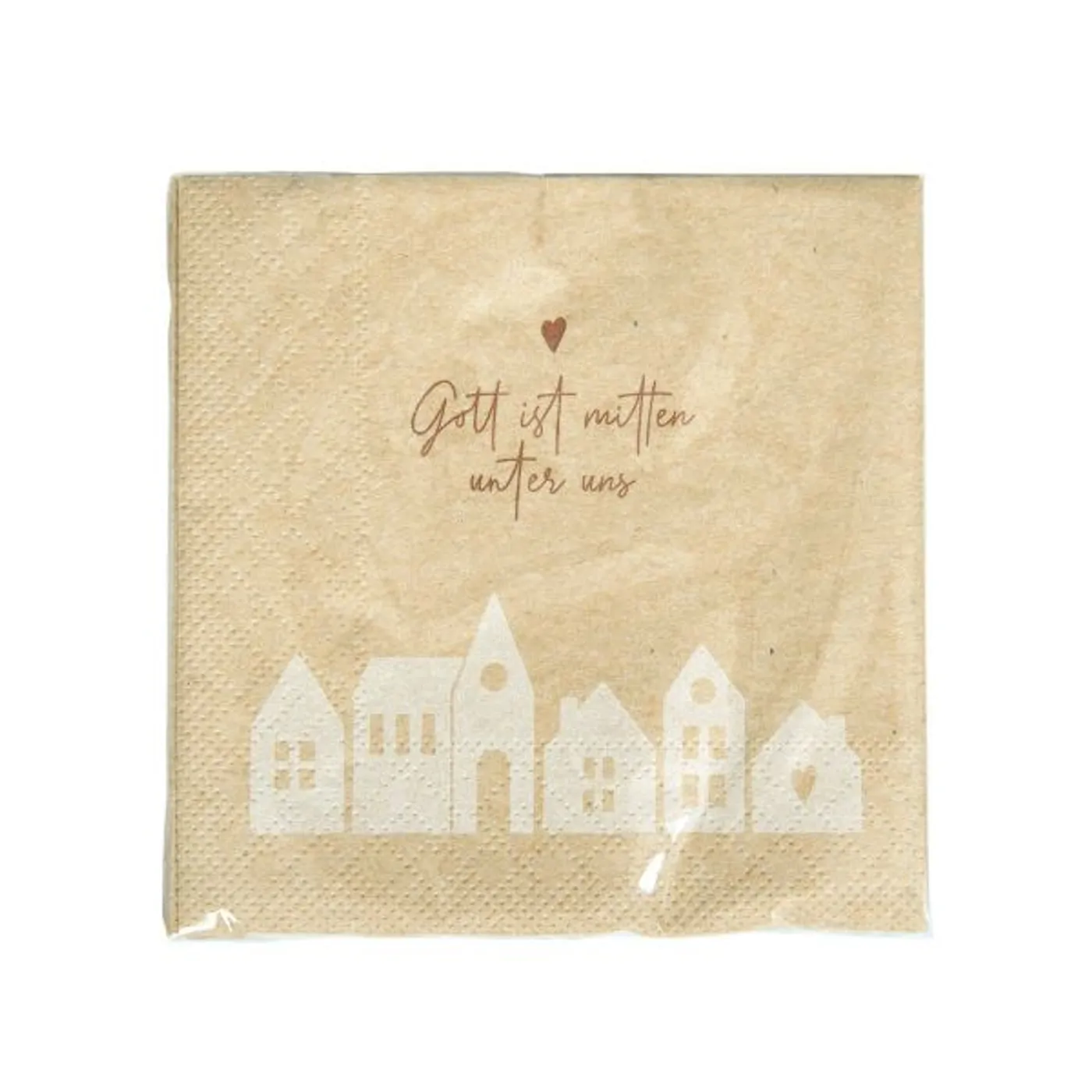 Cocktailservietten mit angesagtem Motiv Häuser und Text: „Gott ist mitten unter uns“. Aus 100% recyceltem 3-lagigen Tissue, 24 x 24 cm, hergestellt in Deutschland, FSC®-zertifiziert.