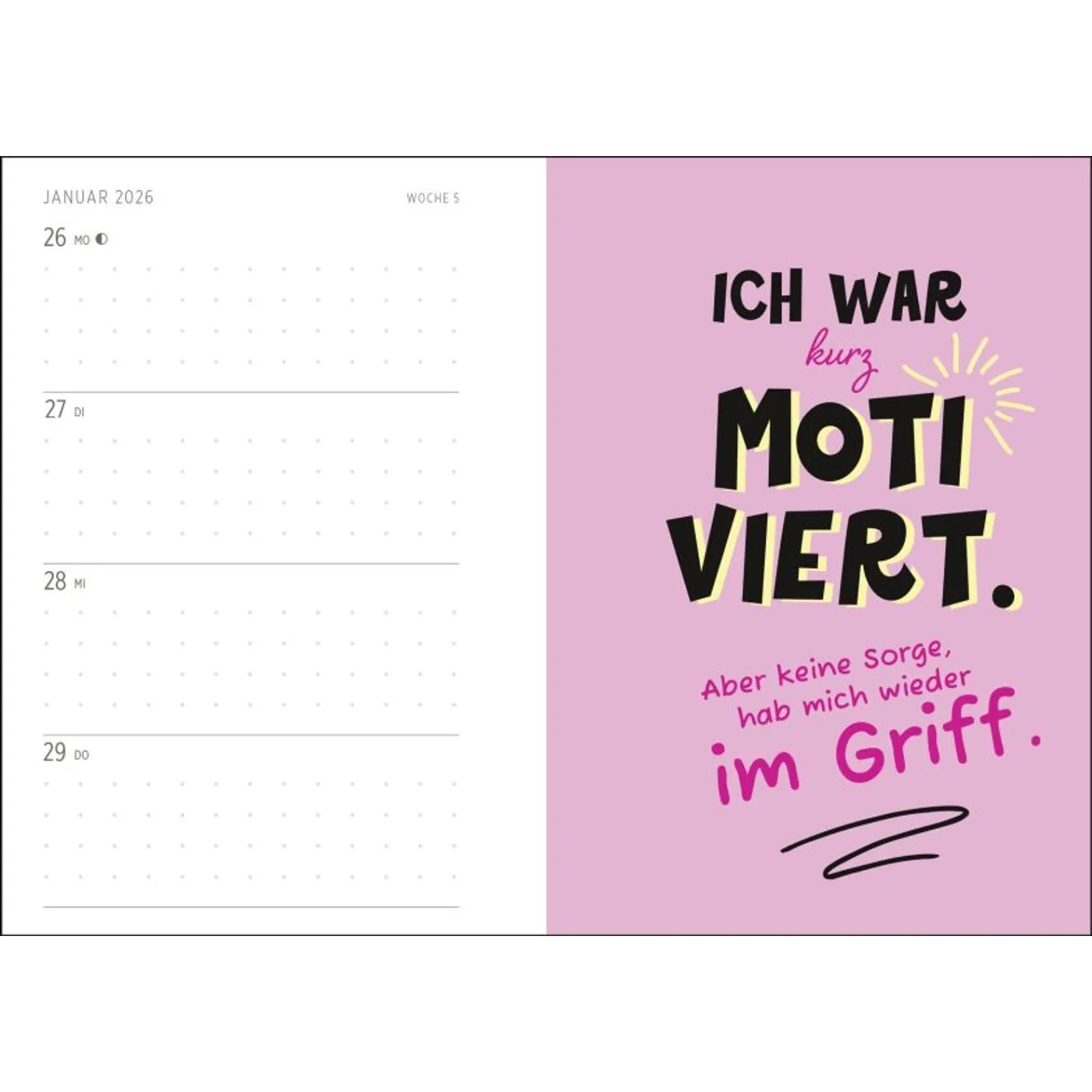 Auch keine Lust auf ambitionierte Neujahrsvorsätze und Optimierungs-Versuche? Lachen Sie dem Jahr 2026 ganz entspannt entgegen – denn mit diesem Taschenkalender sind Sie für alle Lebenslagen gewappnet.