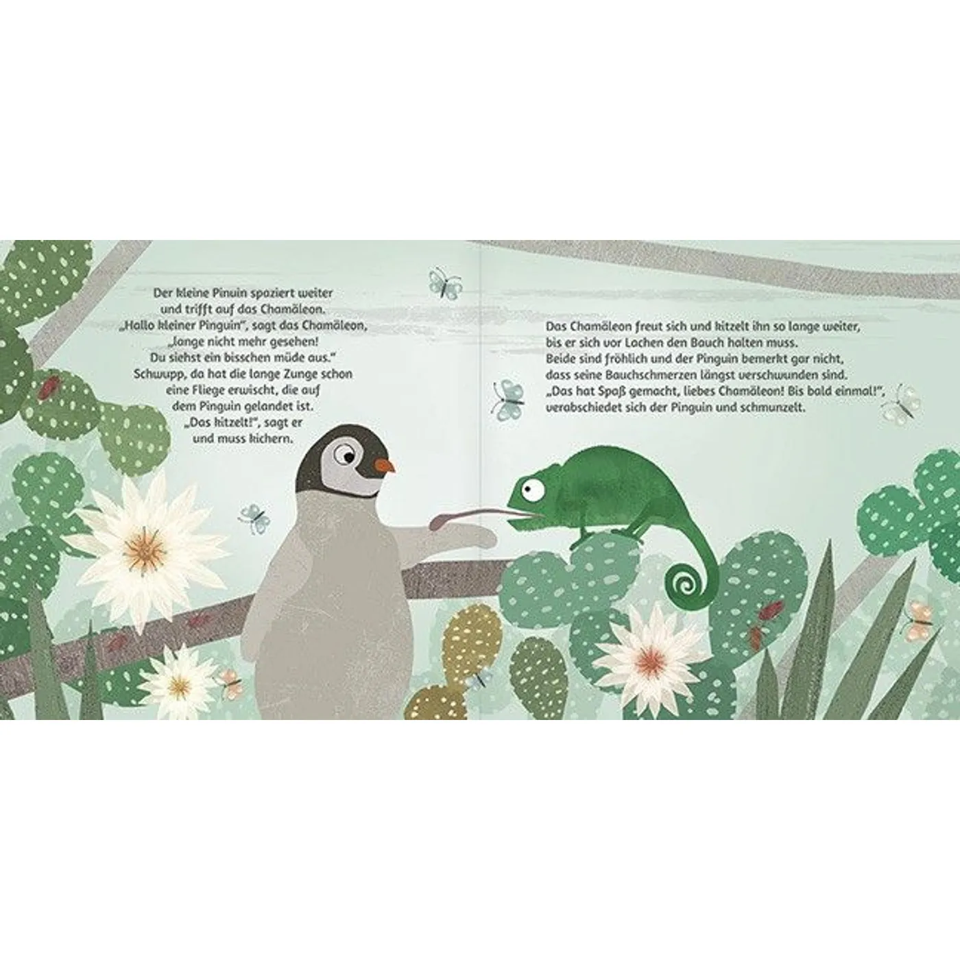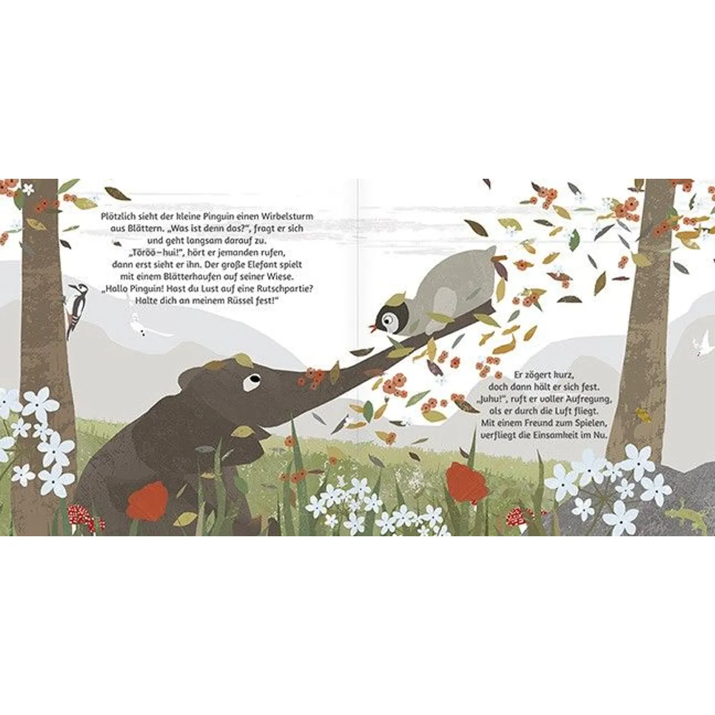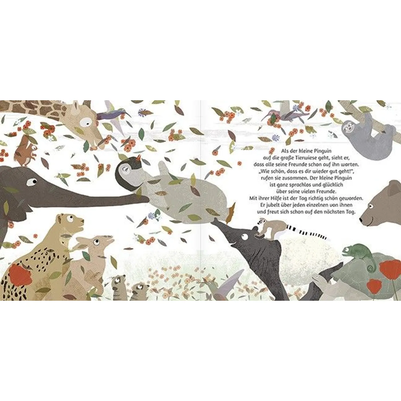- Die originellen Ideen der Freunde des Pinguins. Die Ideen zeigen, dass jeder andere Gaben und etwas Wertvolles zu geben hat. Die große Giraffe etwa schützt den Pinguin wie ein großes Dach vor den Regentropfen, der Bär lädt den Pinguin in seine Höhle ein, um sich zu ihm zu kuscheln und auszuruhen, der Elefant lässt ihn auf seinem langen Rüssel rutschen und der Tapir drückt ihm einen dicken Kuss auf die Wange.