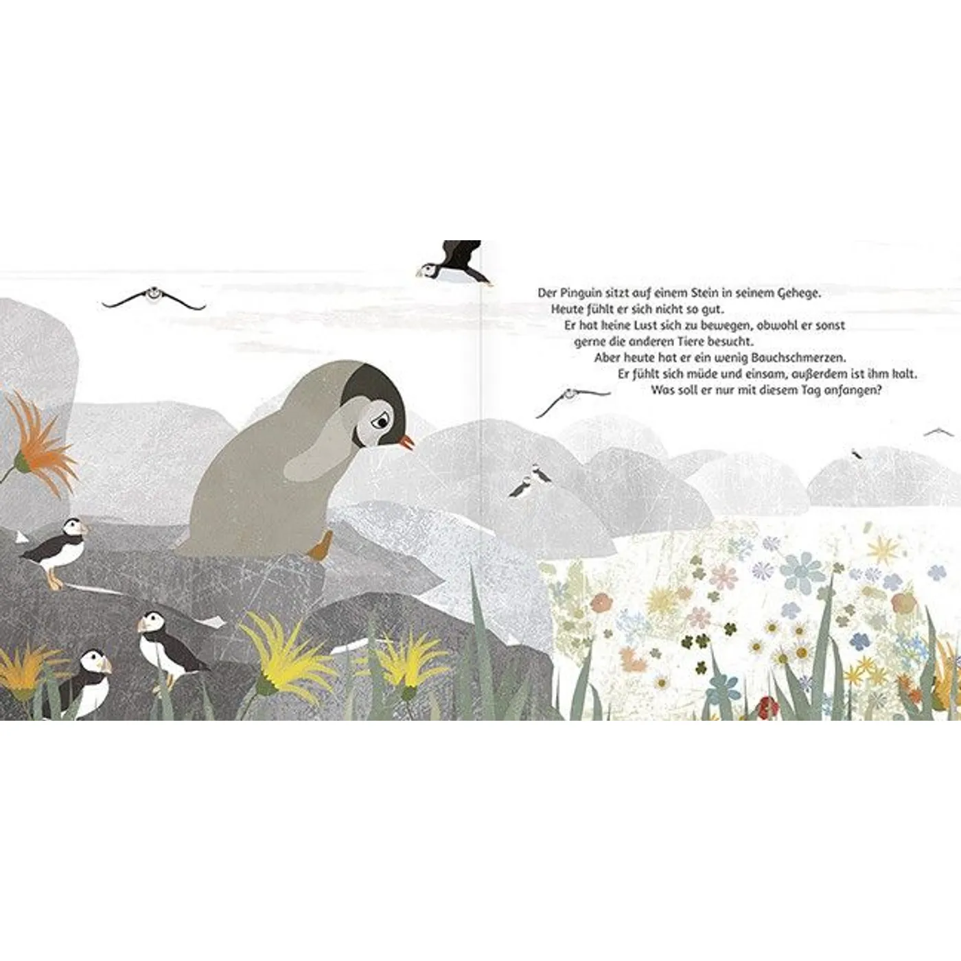 Inhalt: Eines Tages fühlt sich der Pinguin nicht gut. Ihm ist kalt und er hat gar keine Lust auf gar nichts. Er fühlt sich müde und einsam. Was soll er nur mit diesem Tag anfangen? Doch da kommen einer nach dem anderen seine Freunde vorbei und muntern ihn jeweils mit ihrer ganz einzigartigen Gabe auf...