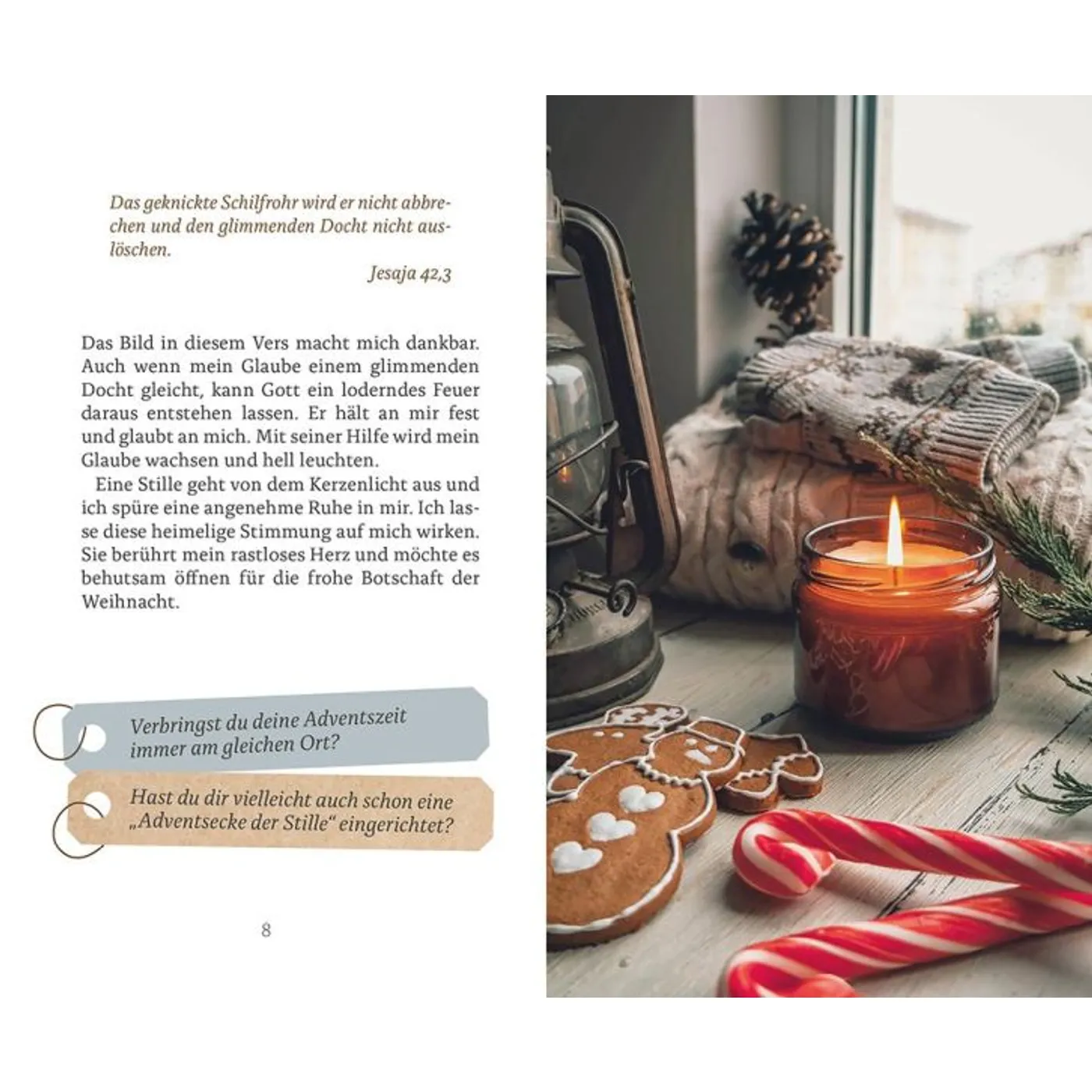 Das Buch kann helfen, im hektischen Weihnachtsalltag zur Ruhe zu kommen. Die einzelnen Kapitel greifen weihnachtliche Themen auf (Pyramide, Nikokaus usw.). Fragen ermutigen, mich zu reflektieren. Gedichte, Gebete und Aussagen bekannter Menschen zu Weihnachten runden das Bild ab. Sogar ein Plätzchenrezept kann man entdecken.