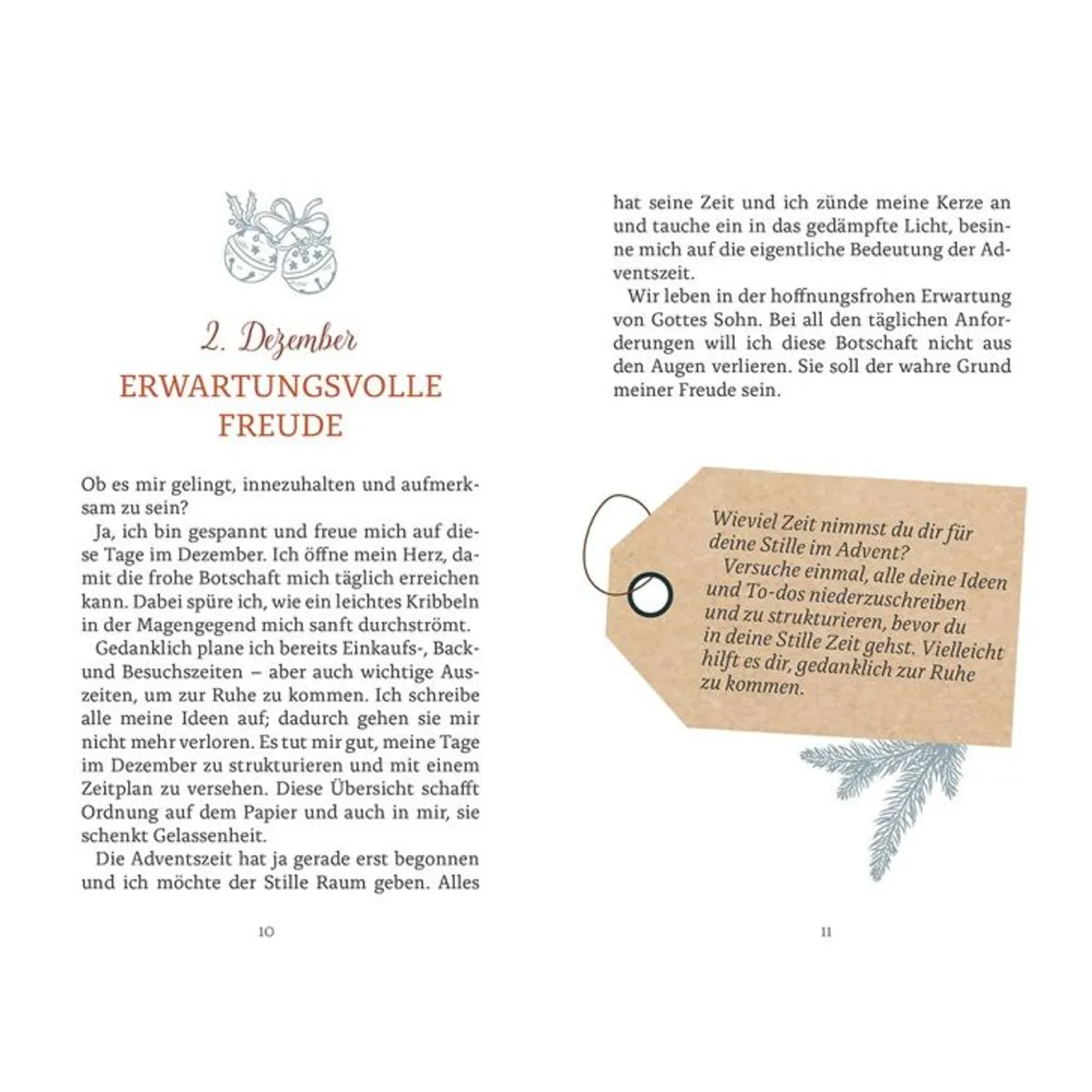 Mit persönlichen Gedanken, Anekdoten und Gedichten kann man vom 1. Dezember bis 1. Januar jeden Tag eine kleine Auszeit genießen, dem Kopf und Herzen Ruhe gönnen und so der Ankunft des Sohnes Gottes eine neue Bedeutsamkeit für das eigene Leben geben.