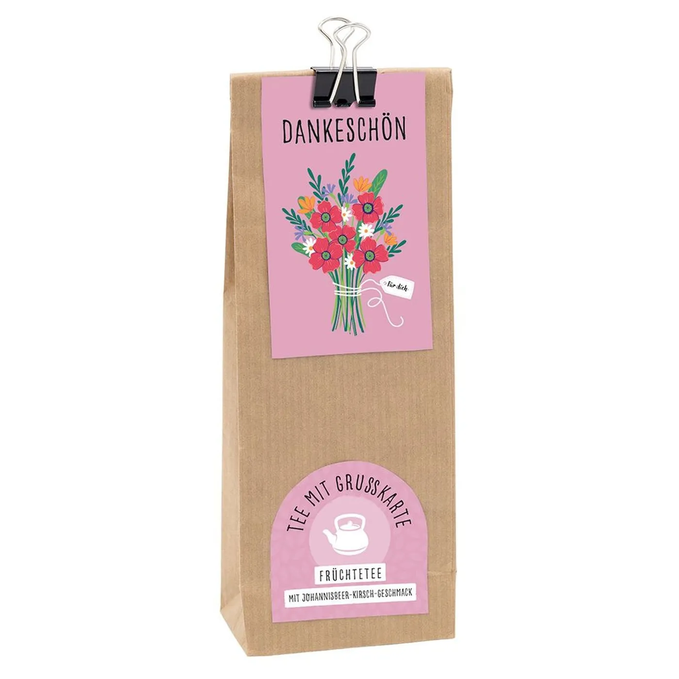 75g Früchtetee mit Johannisbeer-Kirsch-Geschmack, mit Grußkarte und Klammer