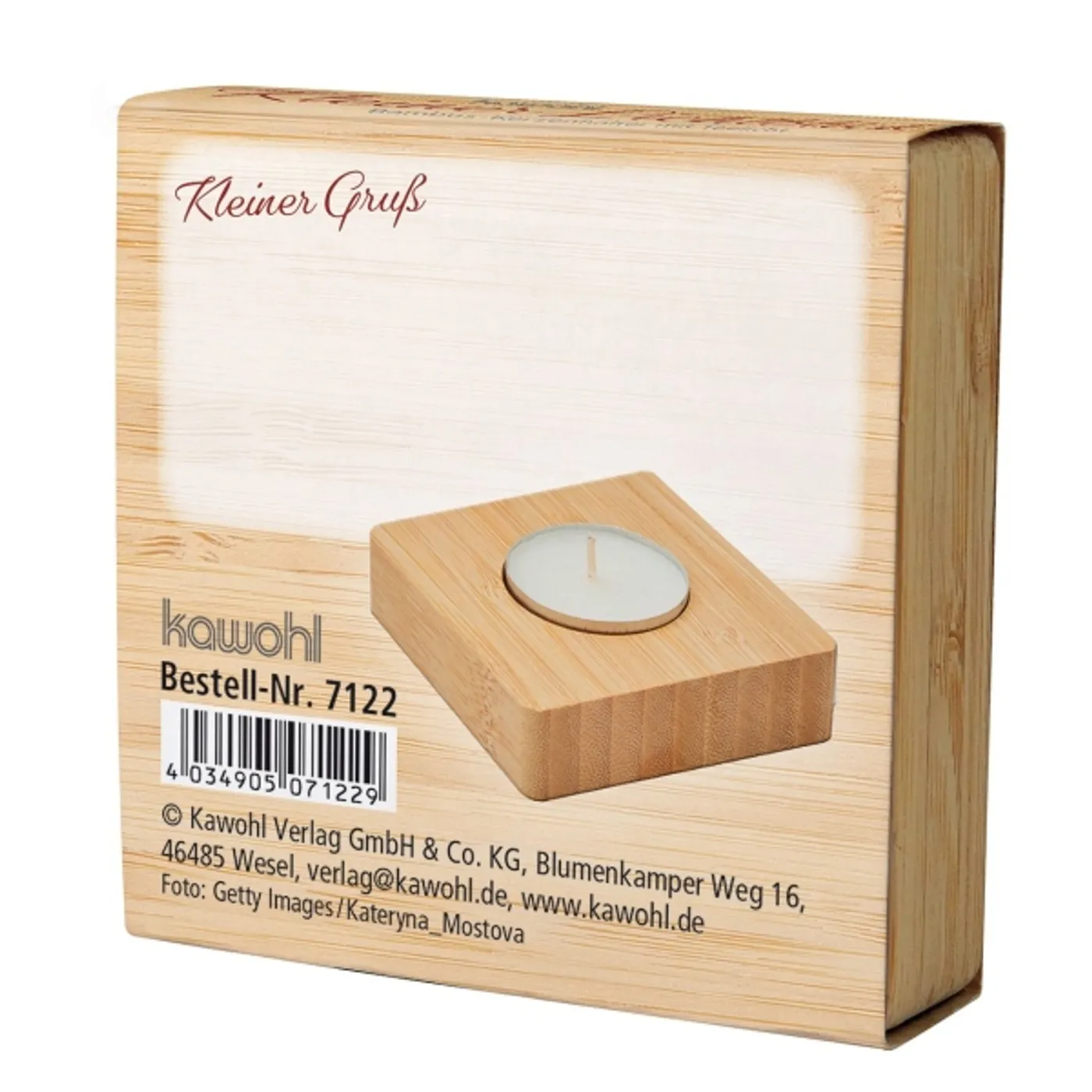 Teelichthalter aus Bambus mit Teelicht in einer gestalteten Banderole mit Widmungsmöglichkeit.