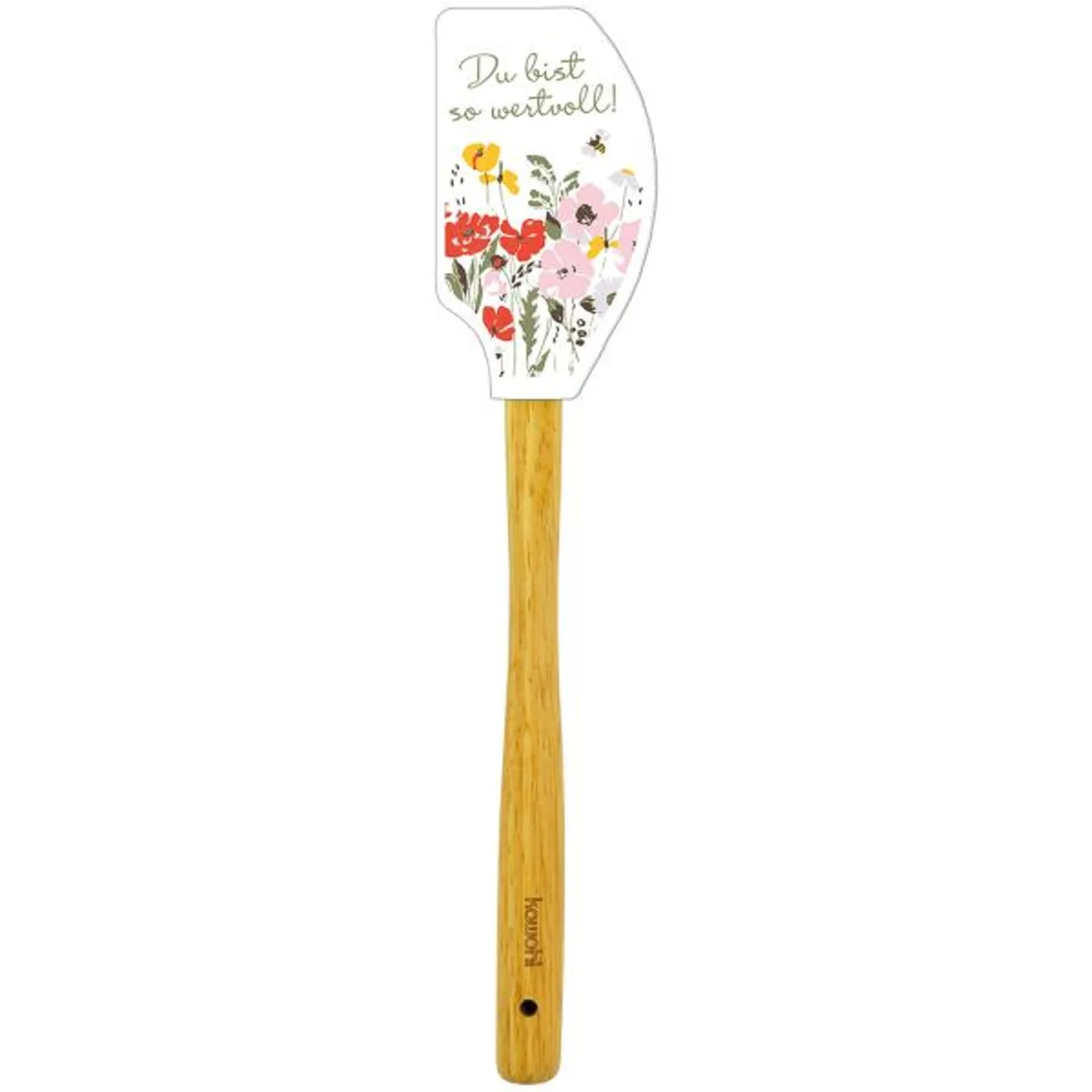 Hochwertiger Teigschaber aus Silikon mit mehrfarbigem Druck - farbenfrohes Motiv. Der Griff ist aus Eichenholz.