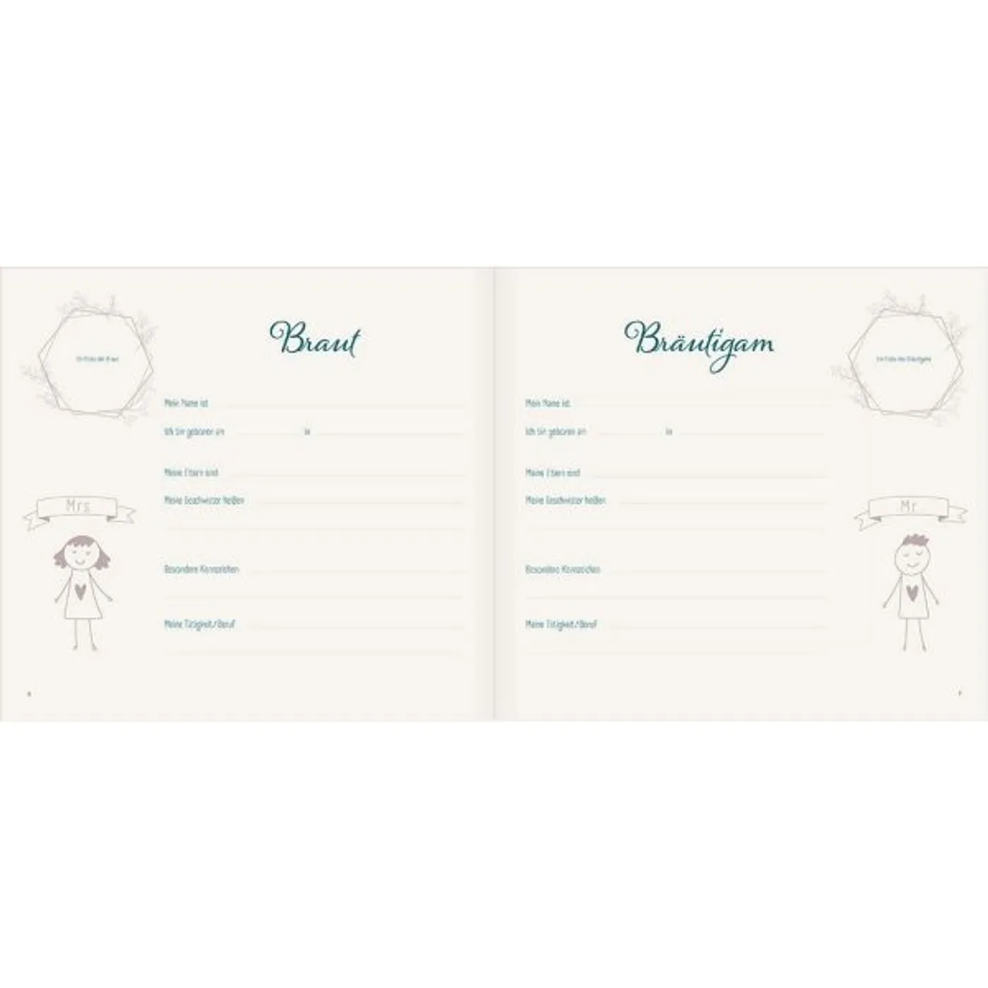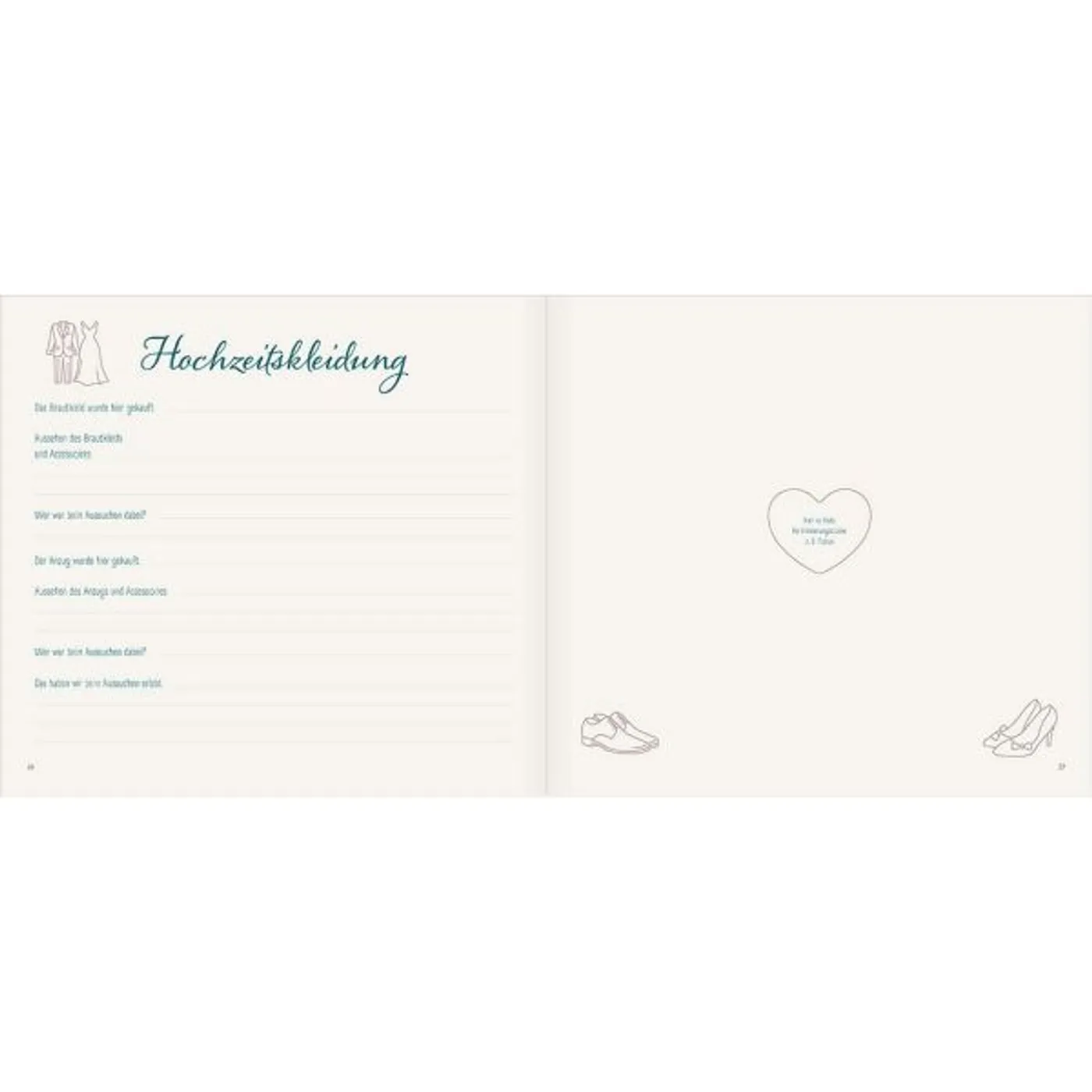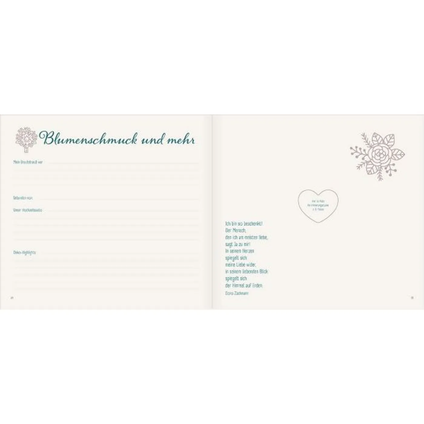 Ein persönliches Hochzeits-Erinnerungs-Album, das viele emotionale Momente dieser wundervollen Zeit festhält. Von Episoden des Kennenlernens über Verlobung bis hin zu Hochzeitsvorbereitungen, Trauspruch, Gästeliste, Flitterwochen und Zukunftsvisionen. Hier findet schriftlich und bildlich Platz, was auch nach Jahren und Jahrzehnten die Herzen höher schlagen lässt.