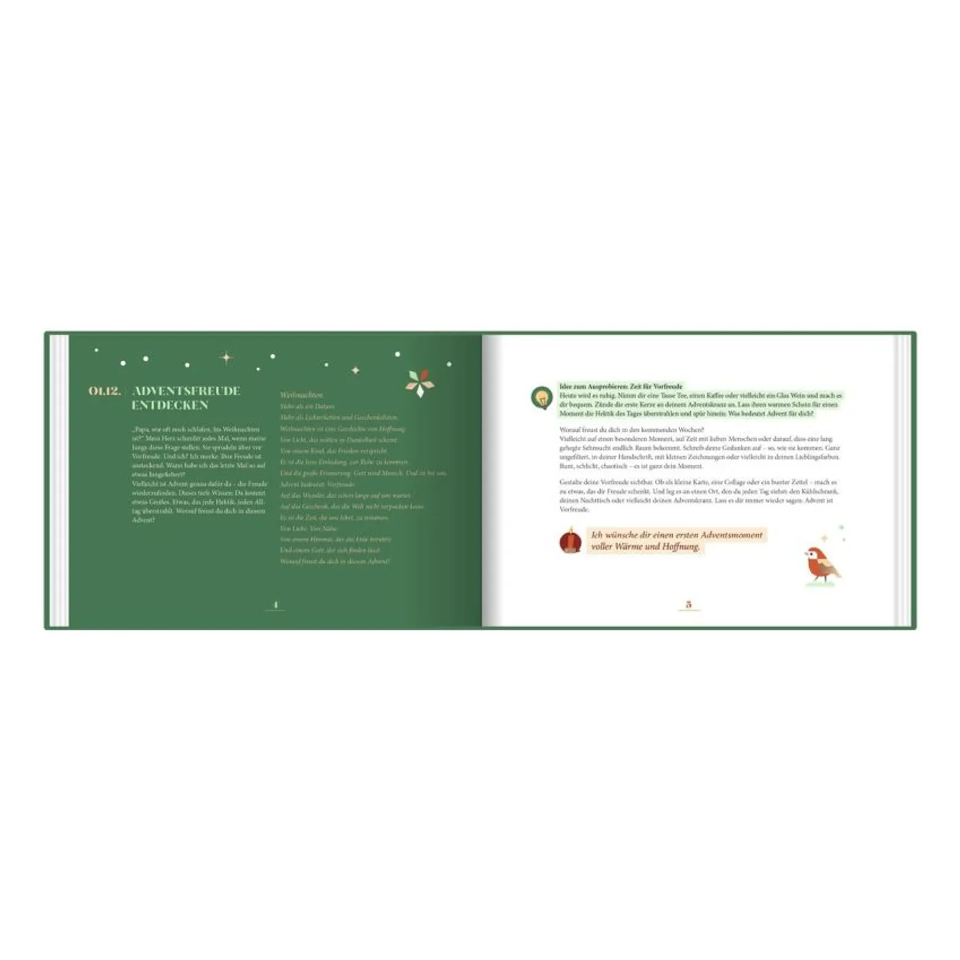Dieses Buch begleitet daher mit stimmungsvollen Texten und Gedichten durch die Advents- und Weihnachtszeit und schenkt täglich einen Moment der Einkehr - mitten im Alltag. Jeder Tag enthält einen kurzen, inspirierenden Adventsimpuls und eine einfache Mitmachidee oder einen Kreativanstoß, die leicht ins eigene Leben integriert werden können: beim ersten Kaffee, auf dem Heimweg oder vor dem Schlafengehen. Es sind kleine Haltestellen, an denen man zur Ruhe kommt und Gottes Nähe spüren kann.