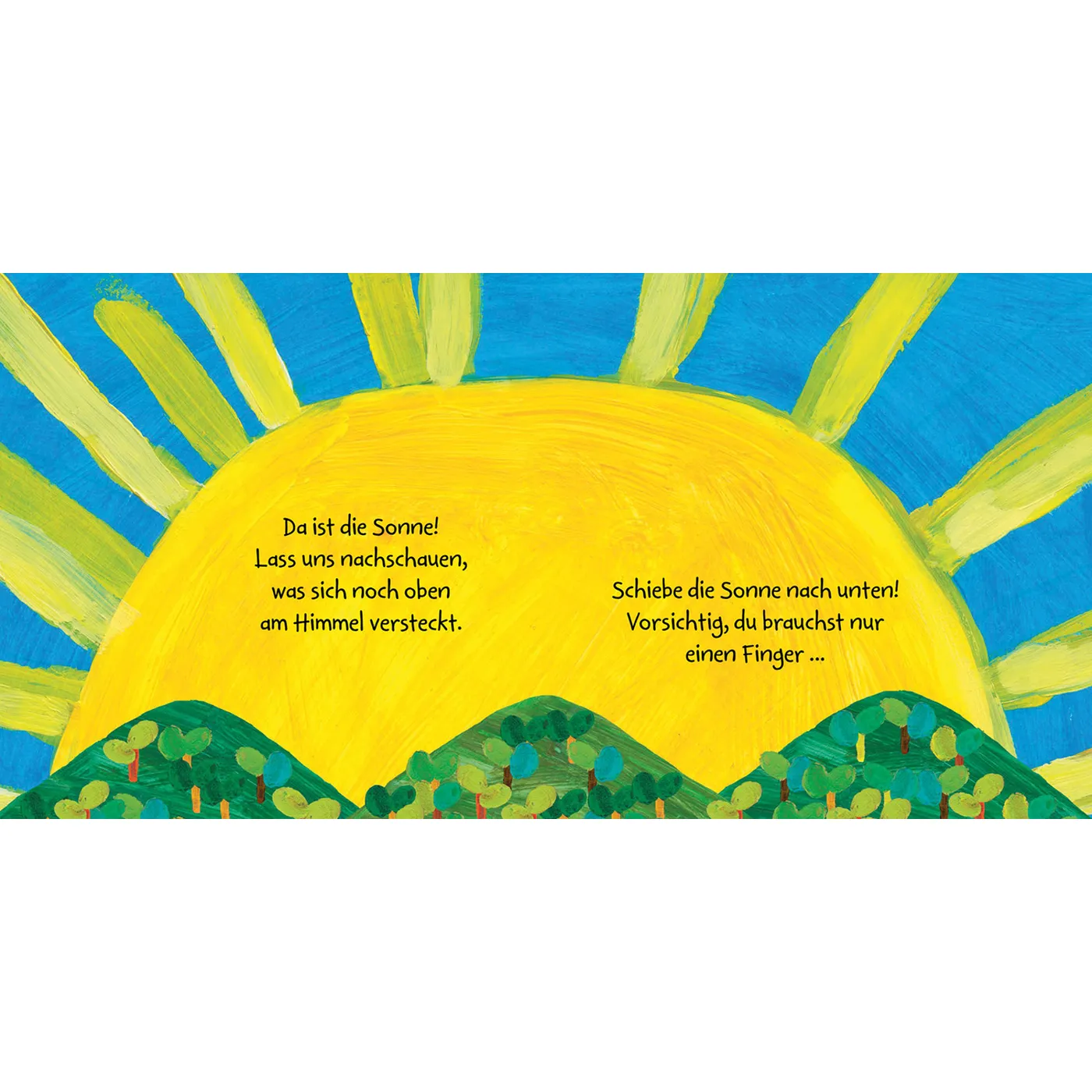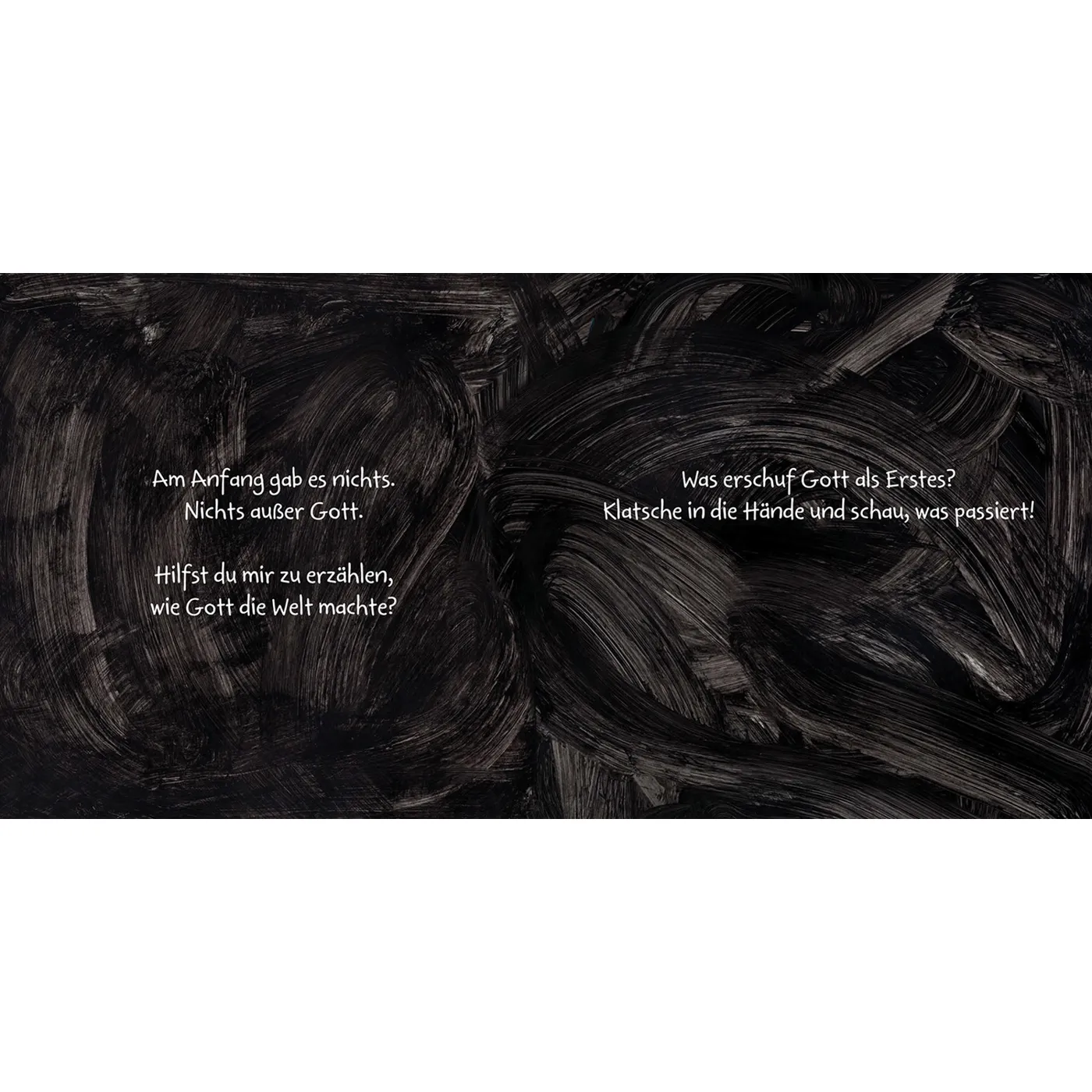 Mit einfachen Texten und sehr schönen Bilder werden die Kleinen auf vielen Seiten eingeladen, die biblische Schöpfungsgeschichte durchs Betrachten und durch eigene Bewegungen wahrzunehmen. Sie werden aufgefordert zu klatschen, zu schütteln, zu pusten oder gar die Sonne nach unten zu schieben, um nachzuschauen, was Gott oben am Himmel noch so gemacht hat. Die Kinder werden so spielerisch neugierig gemacht und können dann auf der nächsten Seite darüber staunen, was Gott sich Tolles ausgedacht und in die Tat umgesetzt hat.