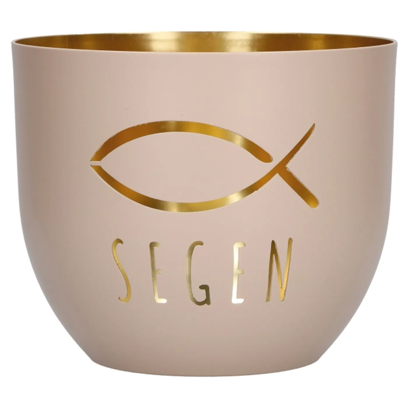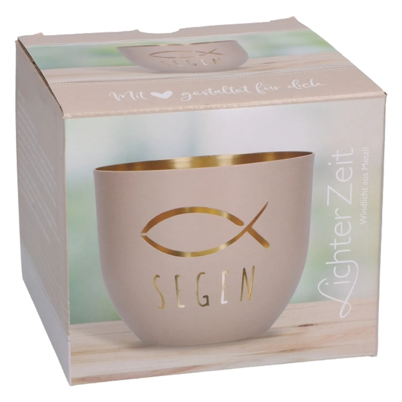 Das LichtMoment „Segen“ ist ein liebevoll gestaltetes Windlicht aus Metall, außen grau-beige und innen goldveredelt, sodass das durchbrochene Motiv beim Anzünden des Teelichts perfekt zur Geltung kommt. Das Wort ""Segen"" und das christliche Fischmotiv macht dieses Metallwindlicht zu einem einzigartigen Geschenk für wichtige Menschen.