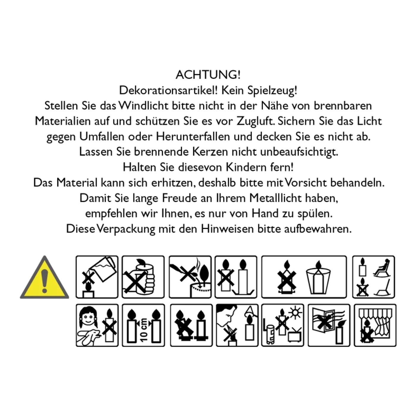 ACHTUNG! Dekorationsartikel! Kein Spielzeug! Stellen Sie das Windlicht bitte nicht in der Nähe von brennbaren Materialien auf und schützen Sie es vor Zugluft. Sichern Sie das Licht gegen Umfallen oder Herunterfallen und decken Sie es nicht ab. Lassen Sie brennende Kerzen nicht unbeaufsichtigt. Halten Sie diese von Kindern fern! Das Material kann sich erhitzen, deshalb bitte mit Vorsicht behandeln. Damit Sie lange Freude an Ihrem Metalllicht haben, empfehlen wir Ihnen, es nur von Hand zu spülen.