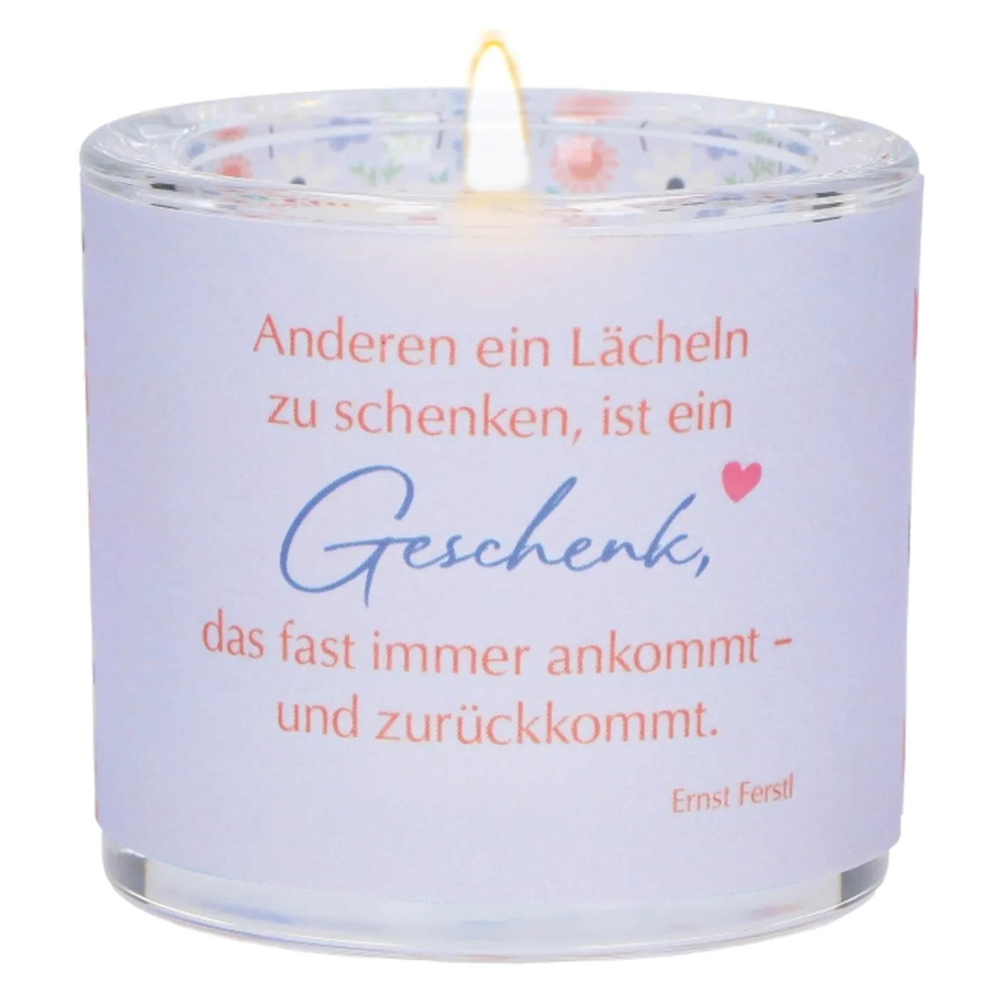 Das LichtMoment „Dankeschön“ ist ein liebevoll gestaltetes Windlicht aus mundgeblasenem Glas, kombiniert mit einem farbig bedruckten Pergamentumleger, der beim Anzünden des Teelichts ein warmes, harmonisches Licht verbreitet. Das berührende Zitat „Anderen ein Lächeln zu schenken, ist ein Geschenk, das fast immer ankommt - und zurückkommt.“ von Ernst Ferstl macht dieses Glaswindlicht zu einem einzigartigen Geschenk für Menschen, mit denen man besondere Augenblicke teilen möchte.