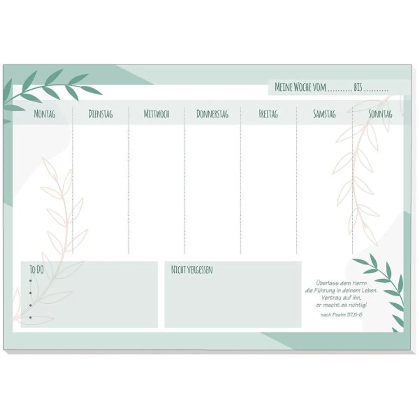 Die Highlights der Woche sind auf einen Blick erfassbar, und es bleibt genügend Raum für wichtige Notizen und Aufgaben. Ein täglicher, ermutigender Bibelvers setzt einen inspirierenden Akzent.
