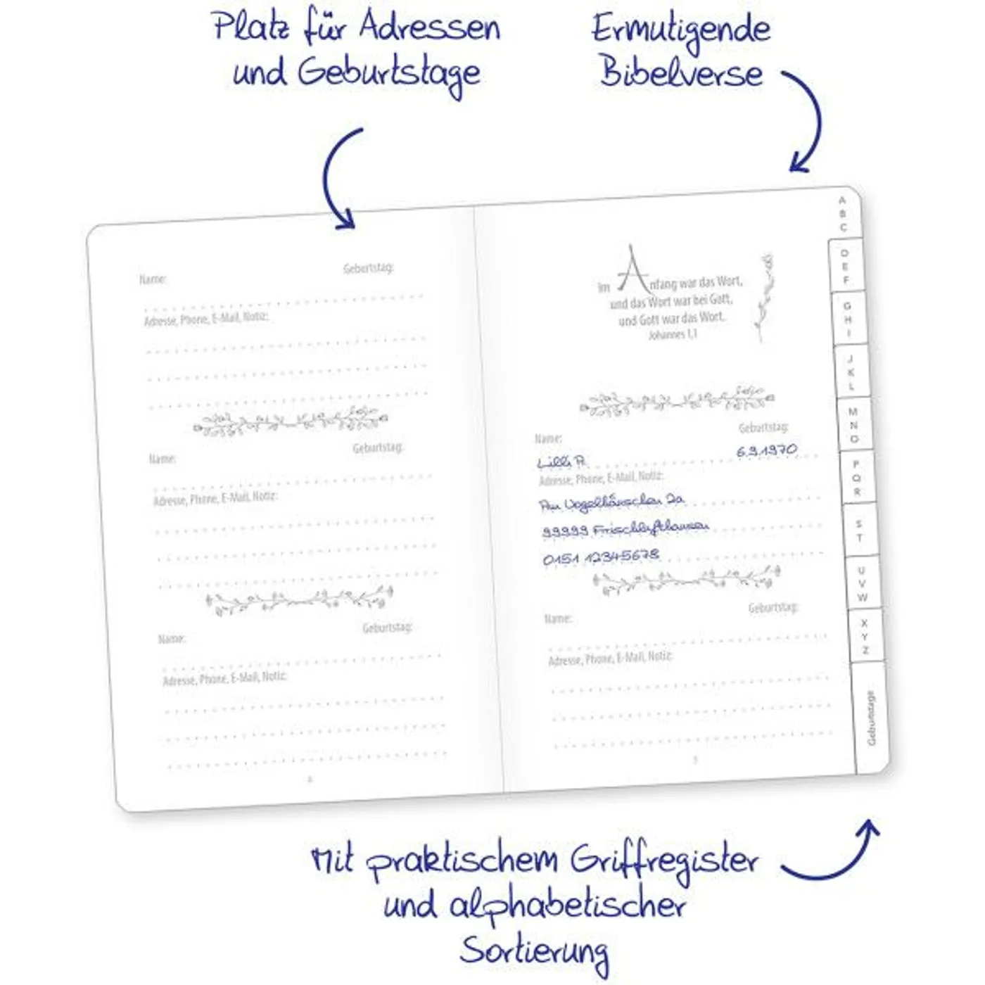 Das Leben wird reich durch die Menschen, die darin vorkommen! Dieses hübsch gestaltete Adressbuch versammelt alle Lieben alphabetisch geordnet und mit praktischem Griffregister. Außerdem enthält es einen Geburtstagskalender, damit kein Jubeltag vergessen wird. Die schmückenden Bibelverse aus dem Buch können direkt als Inspiration für die nächste Geburtstagskarte dienen. Ein hübscher Alltagsbegleiter, den man immer wieder gerne zur Hand nimmt.