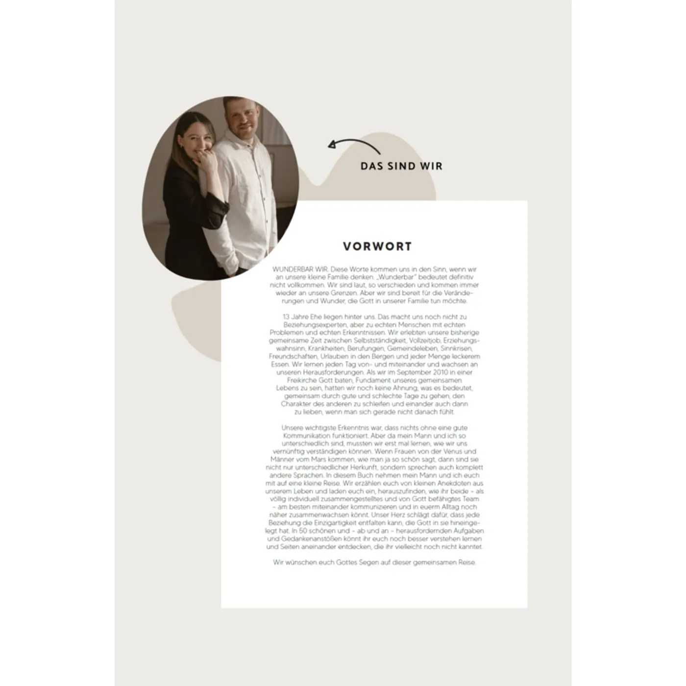"Wunderbar wir" wurde von einem liebenswerten Paar mit 13 Jahren Eheerfahrung gemeinsam geschrieben und entwickelt, um Ehepaare wieder mehr in die Kommunikation zu bringen. Denn genau das ist eine Erkenntnis der Autoren. Nichts geht ohne eine gute Kommunikation. Dabei steht aber auch der christliche Glaube an erster Stelle, aber unaufdringlich und eher liebevoll unterstützend.