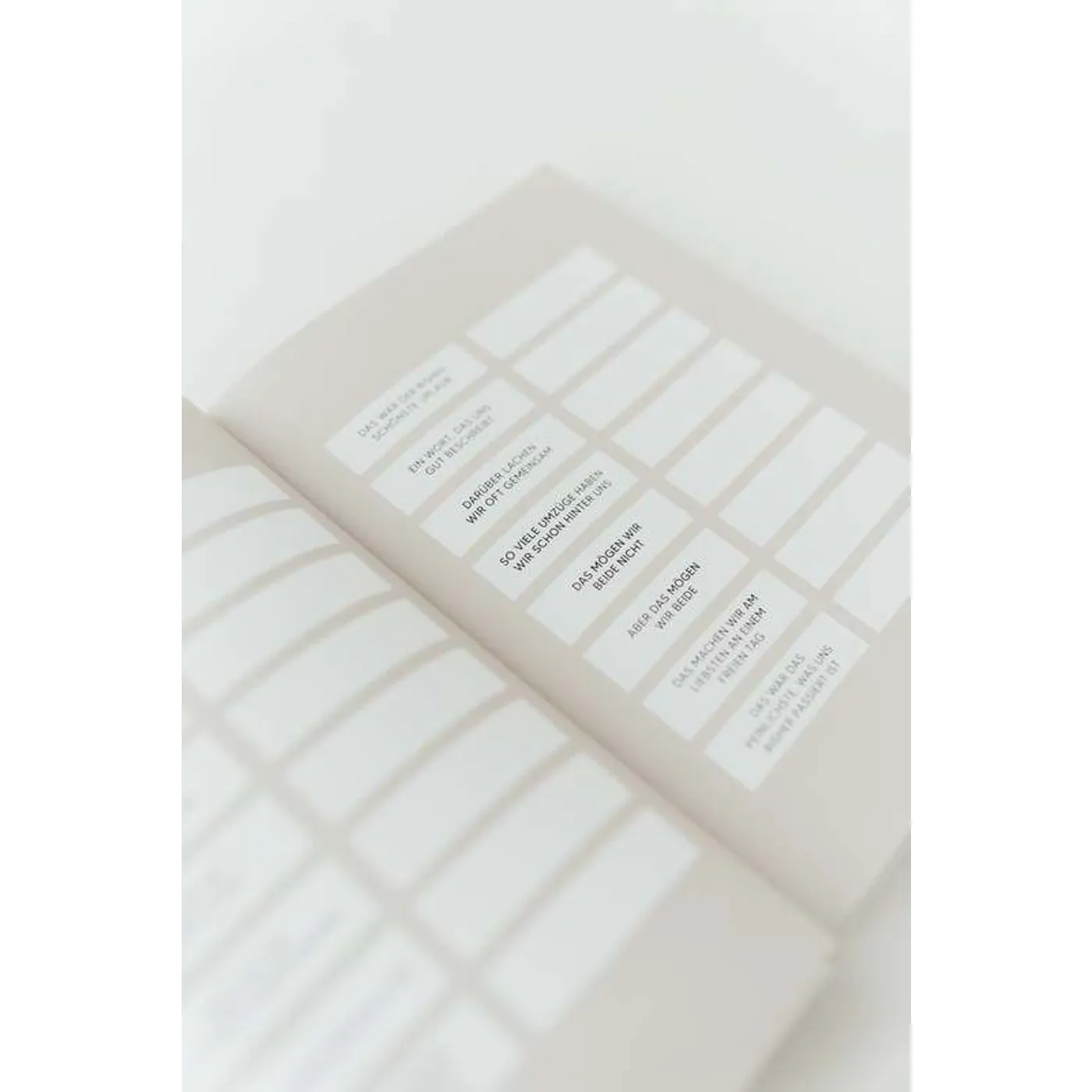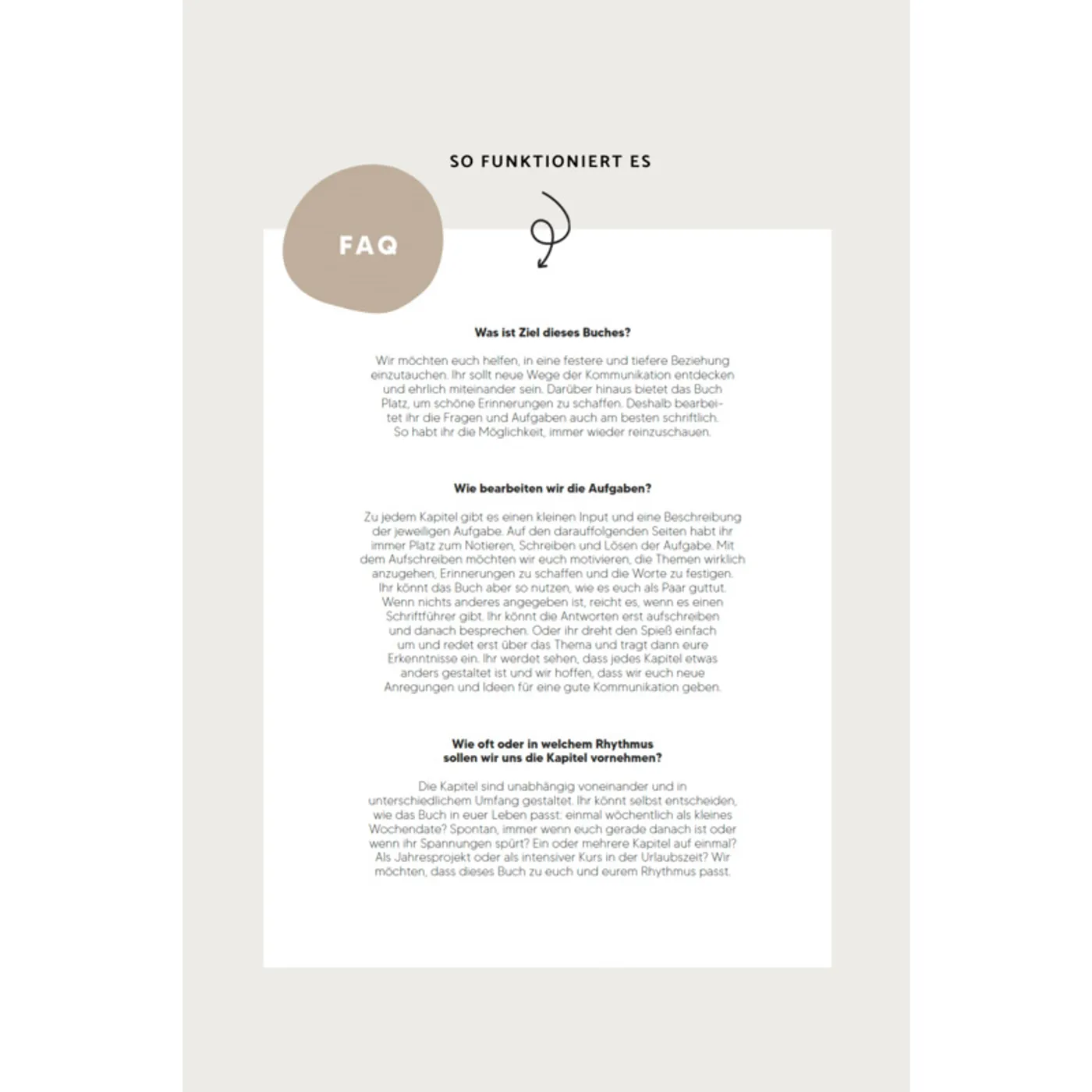 Es sind kurze, tiefgründige Texte, die zum Nachdenken anregen und Paare ins Gespräch bringen. Zu jedem Kapitel gibt es Fragen oder eine Aufgabe mit viel Platz für Notizen. Ob man ins Buch reinschreiben will oder die Fragen nur mündlich durchgeht, ist jedem Paar selbst überlassen. Die Fragen und Aufgaben sind so gestellt, dass Beide zu Wort kommen. Auf eine ungezwungene Art und Weise wird ermutigt über Gefühle zu reden oder darüber, was einen in der Partnerschaft triggert, aber auch über ganz praktische Dinge wie beispielsweise den Haushalt als Paar zu organisieren oder seine ToDo’s abzuarbeiten.