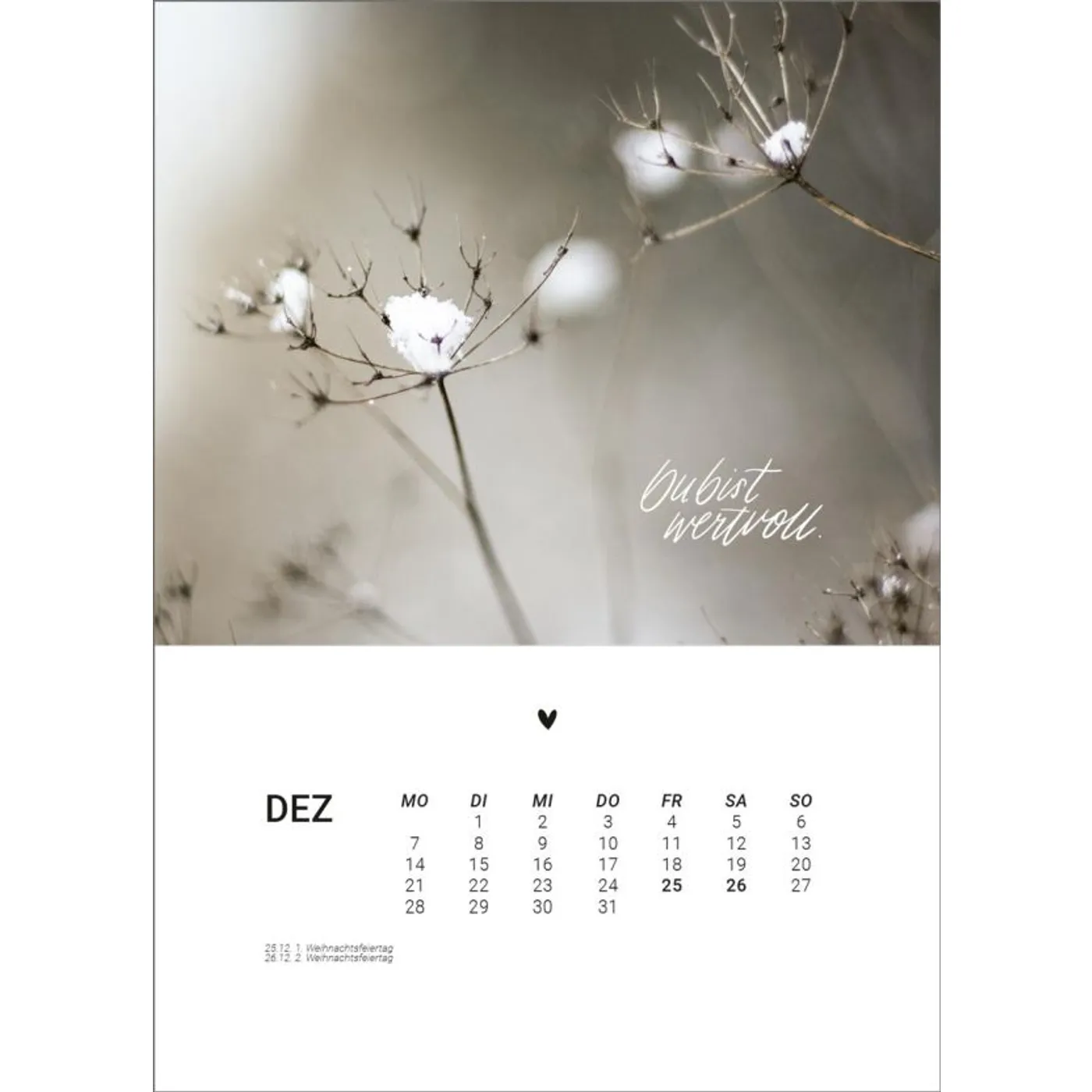 Der Tischkalender „Zweitausendsechsundzwanzig“ von Anna Scholdei ist eine stilvolle Inspirationsquelle für das ganze Jahr. Jede der 12 Monatskarten und das Titelblatt verbinden ausdrucksstarke Fotomotive mit ermutigenden Bibelversen aus Sprüche 31. Dabei stehen Weisheit, Fürsorge, Fleiß und innere Stärke im Mittelpunkt – Tugenden, die den Alltag verschönern und geistlich bereichern.